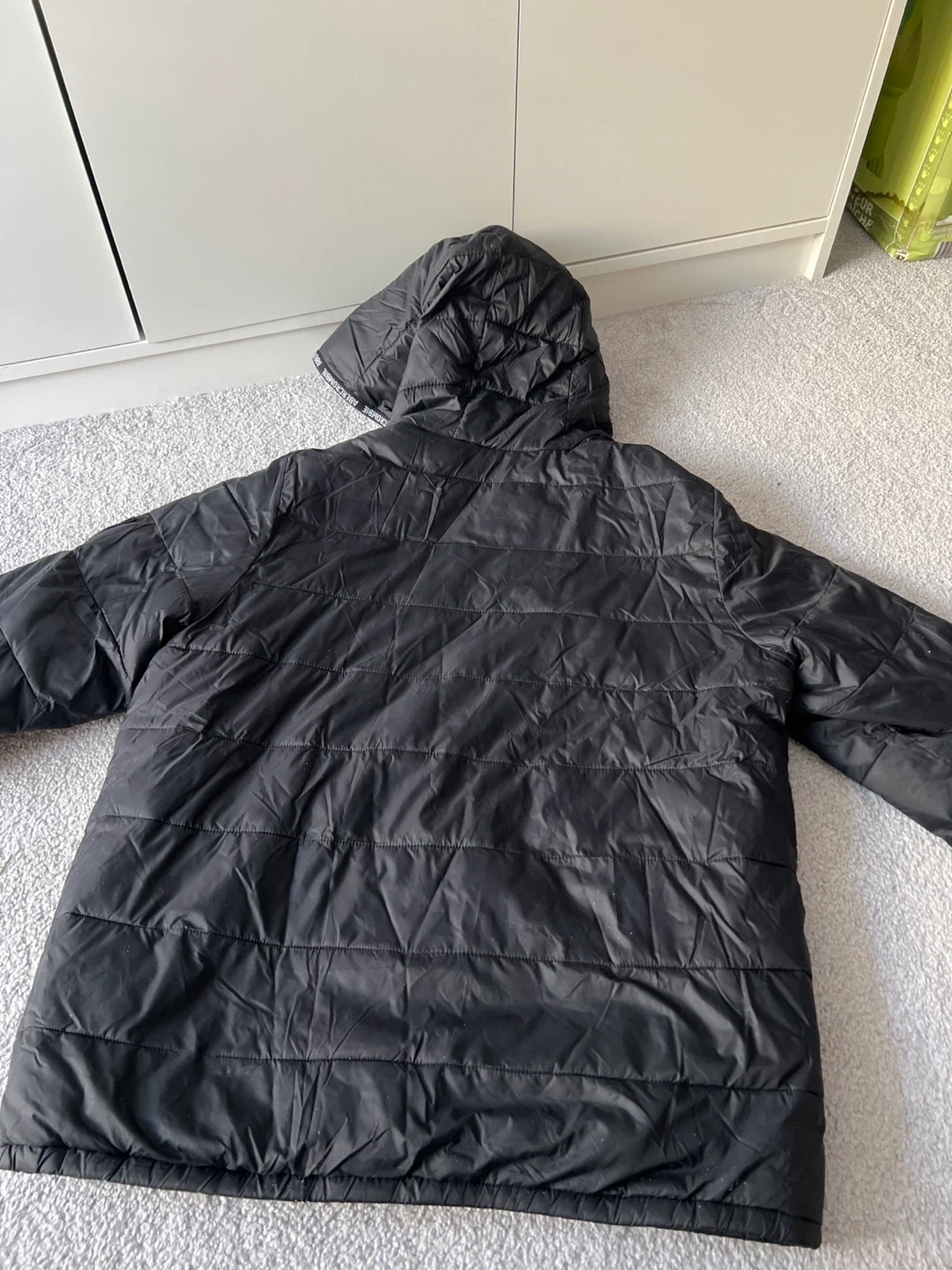 Black puffer winter jacket from Abercrombie Kids. It's fully lined with soft grey faux fur for extra warmth. Made in Vietnam. Size 15/16.