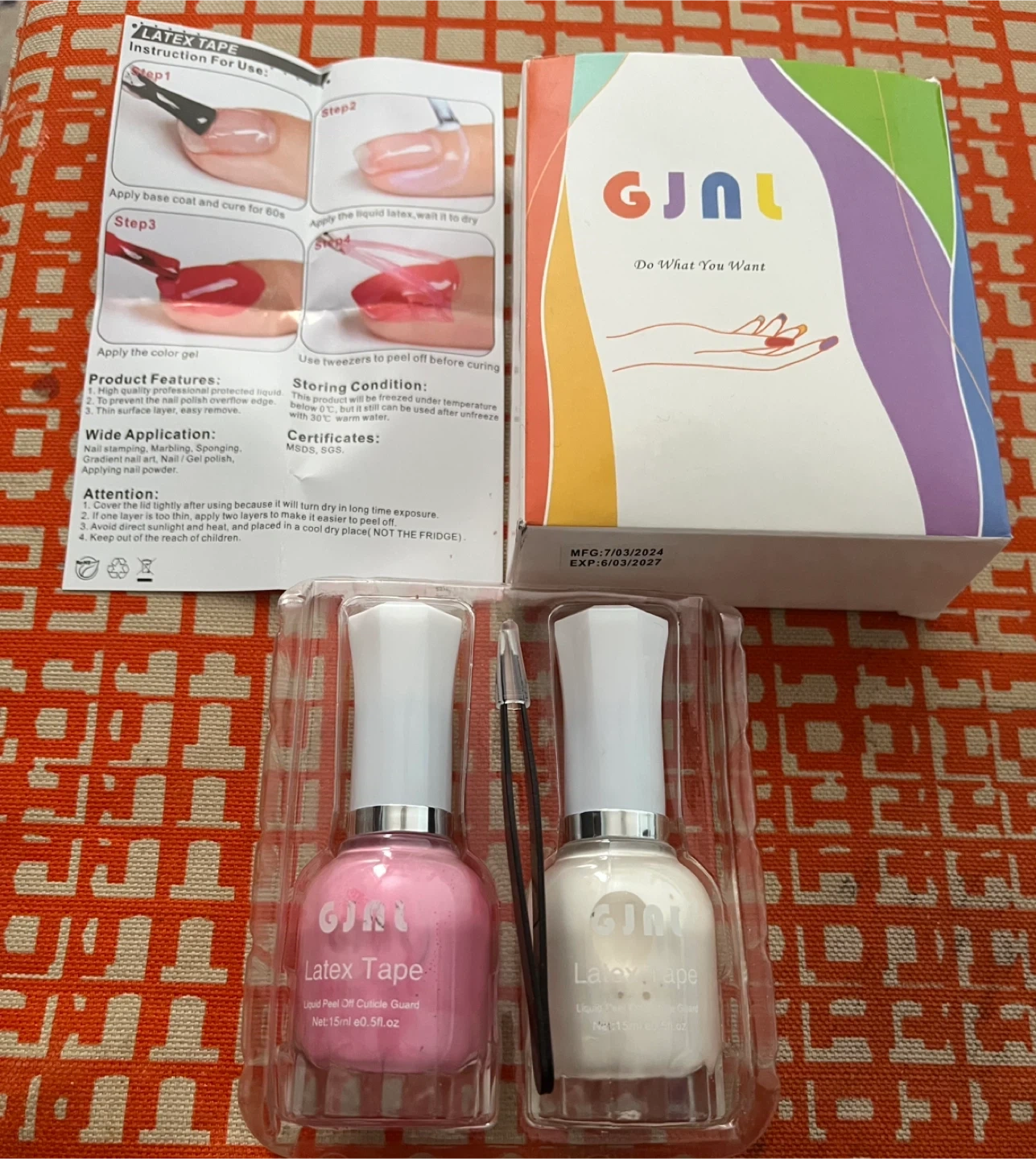 This set includes two bottles of GJAL Latex Tape, each 15ml. It's a liquid peel-off cuticle guard designed to prevent nail polish from getting on the edges. The product has an MFG date of March 7, 2024, and an EXP date of March 6, 2027. This guard is useful for nail stamping, marbling, and gradient nail art.