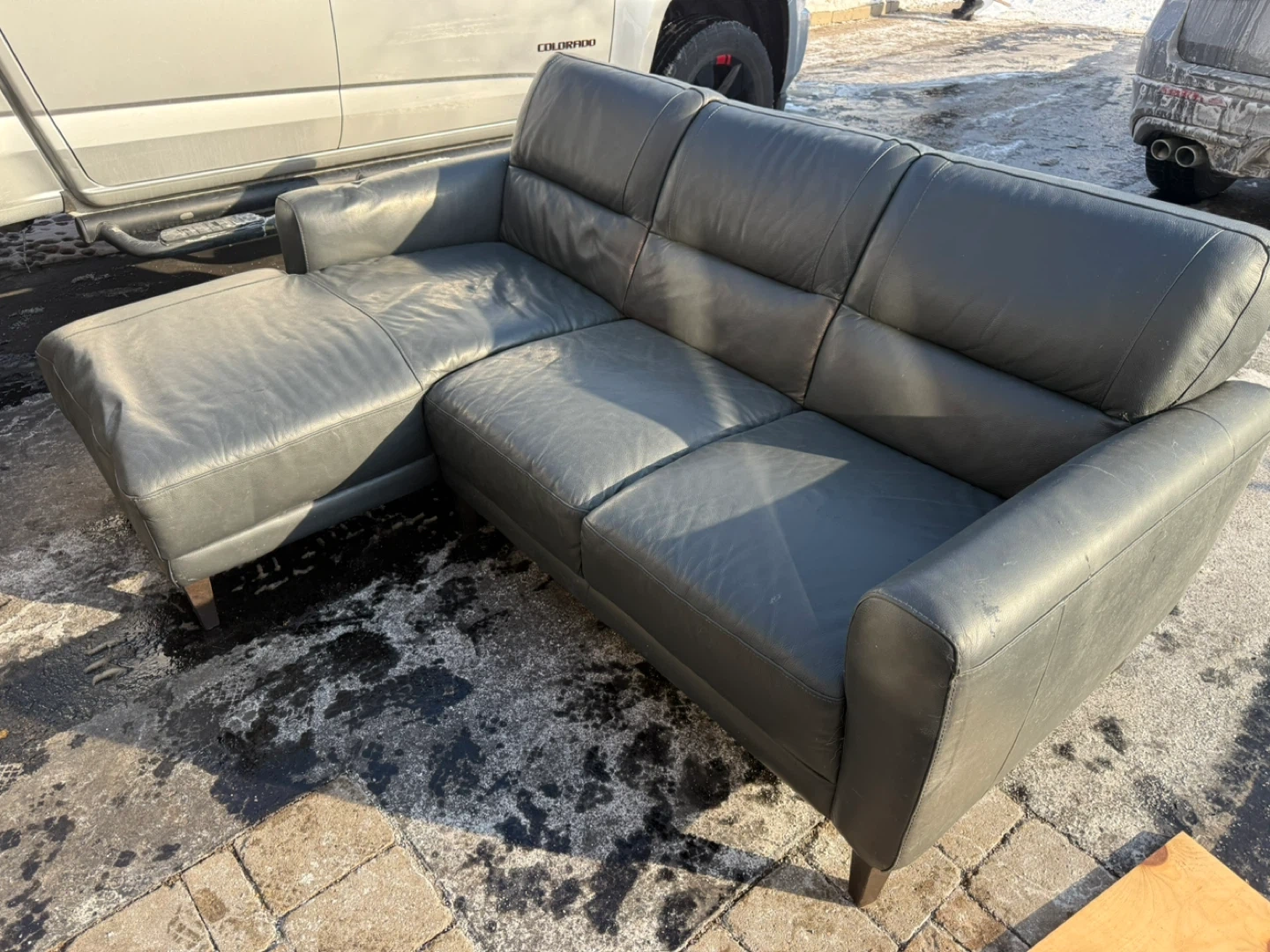 Grey leather sectional sofa with a chaise. It's a comfortable addition to any living space. Upholstered in durable leather.