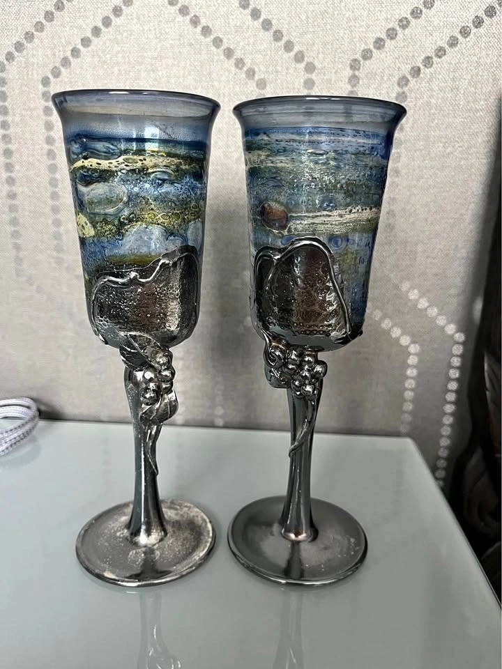 Vintage Hand Blown Glass & Silver Plated Champagne Flutes (Pair)