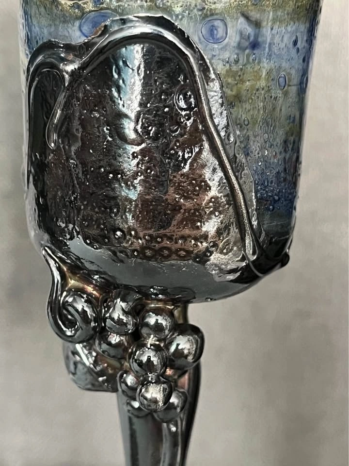 Beautiful, vintage, artisan-made, one-of-a-kind, hand blown glass and silver plated champagne flutes. Features blue and green glass with grape vines sculpted into flute stems. Made in France. Price is for the pair.