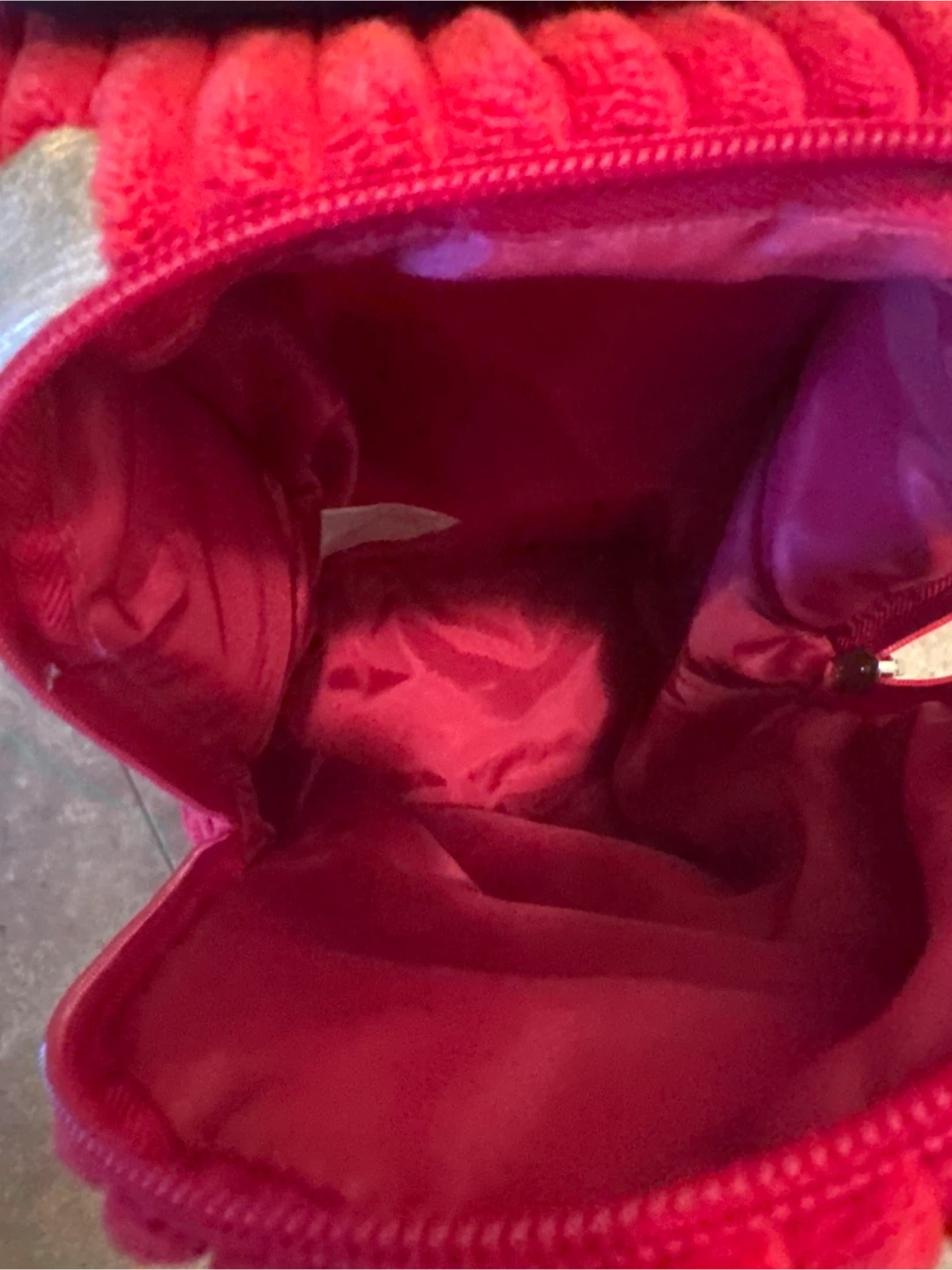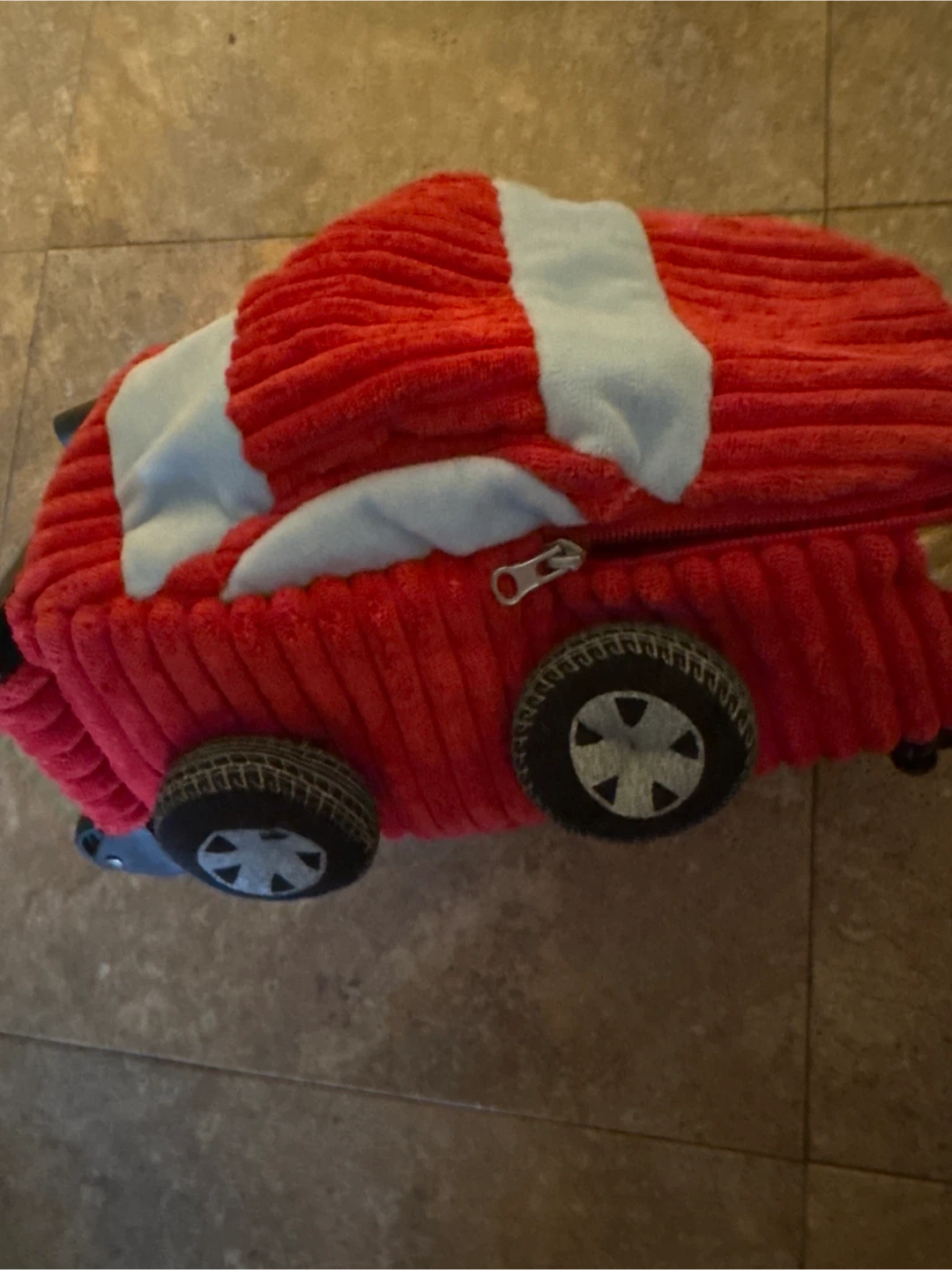 Kids rolling luggage designed like a red car with white accents. It's made of soft, plush material and features wheels and a retractable handle. Plenty of space inside for travel essentials!