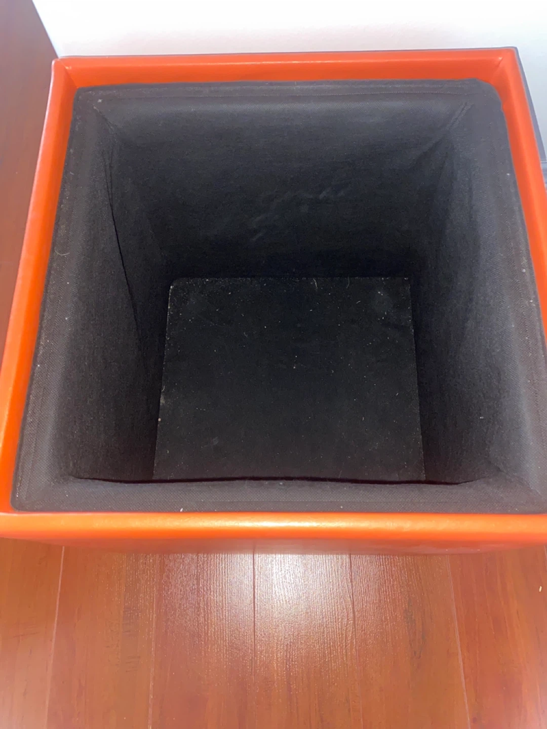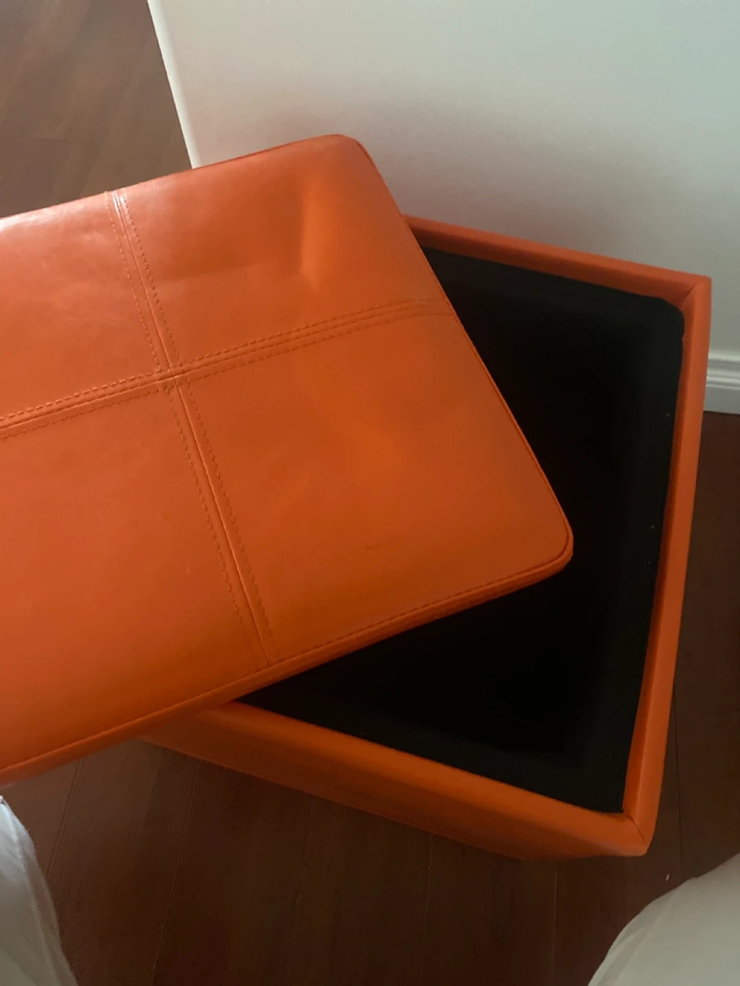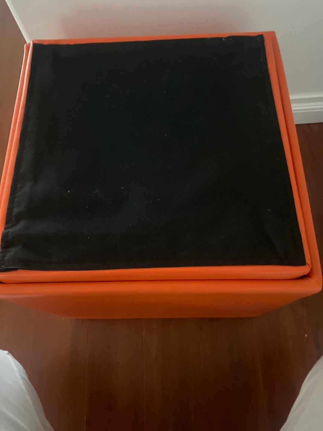 This orange storage ottoman offers a place to sit and tuck away items. It's made of faux leather and has a stitched top. The interior is lined with black fabric. Great for extra seating or stowing blankets!