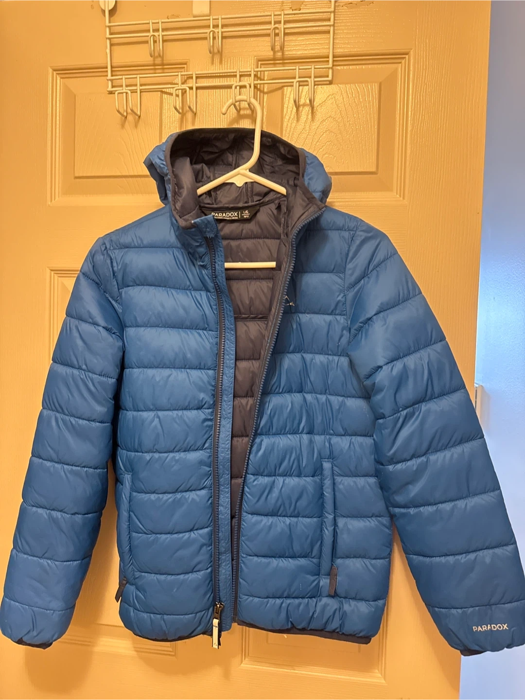 This blue Paradox puffer jacket is a size 10/12. It's made in Cambodia and features a hood. A reflective strip is on the back for added visibility.