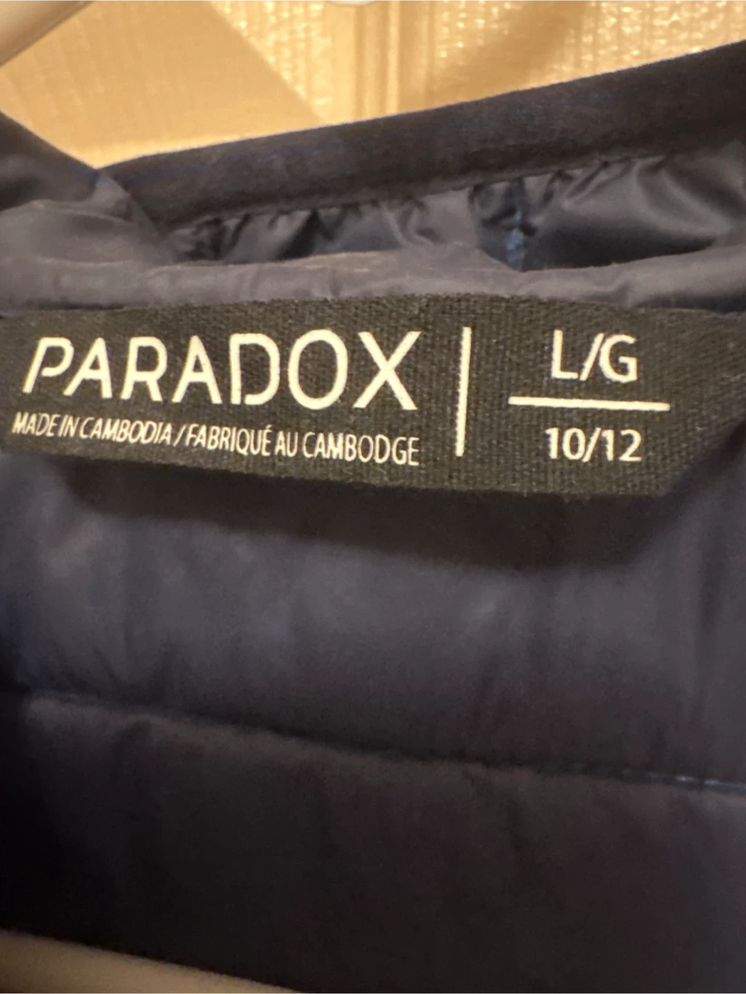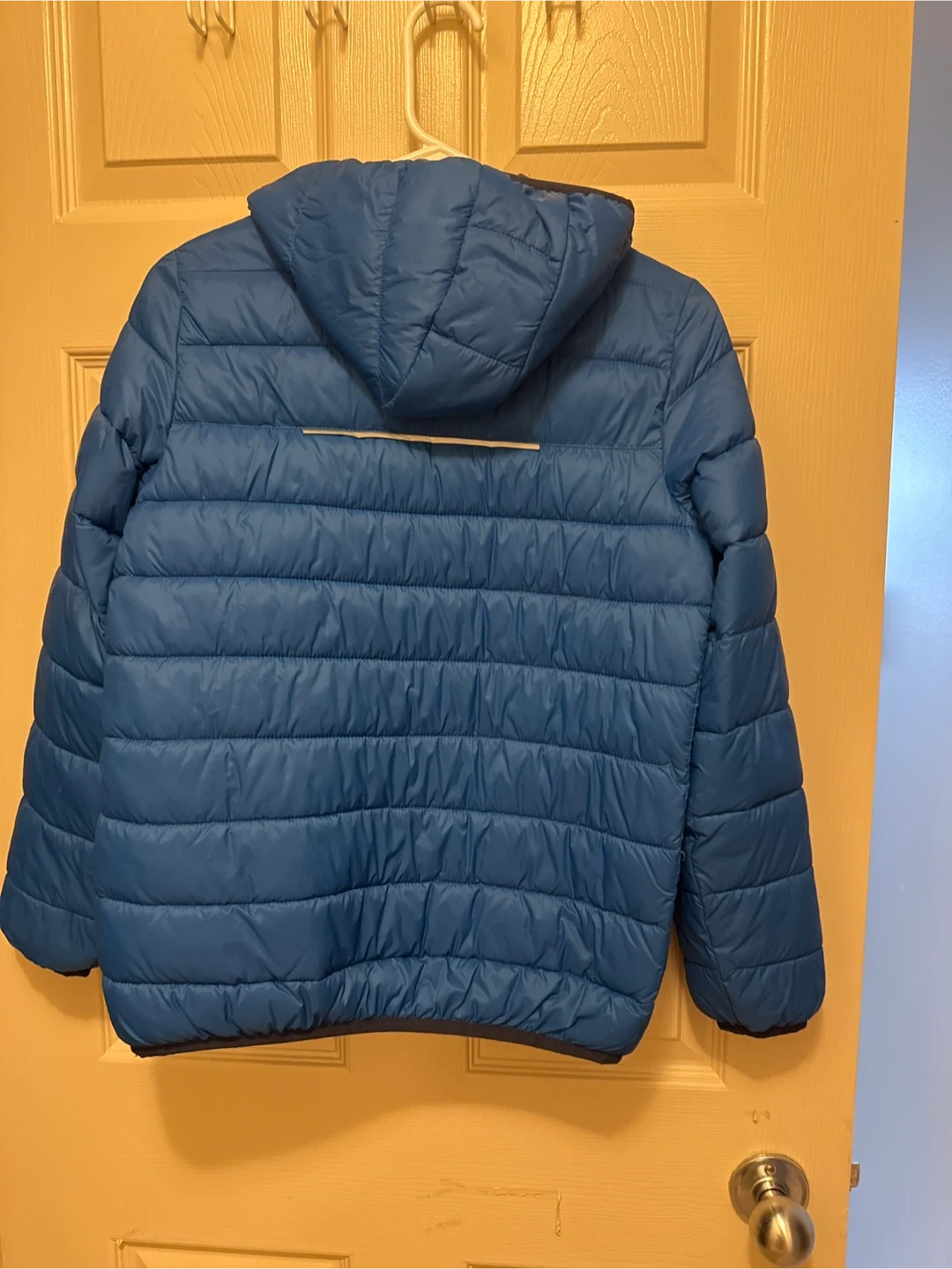 This blue Paradox puffer jacket is a size 10/12. It's made in Cambodia and features a hood. A reflective strip is on the back for added visibility.