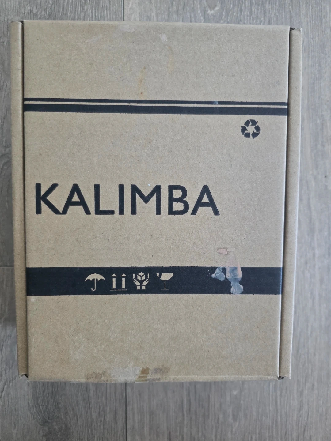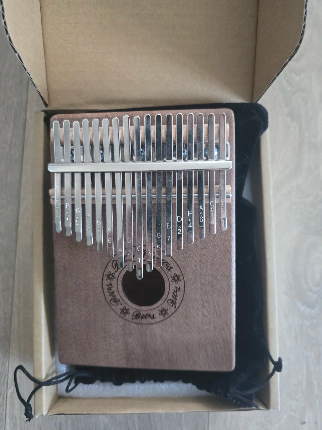 17-key kalimba made of wood and metal. The keys are labelled with musical notes and numbers for easy play. Comes with a black velvet bag for storage. Box is dirty from storage but Kalimba is untouched