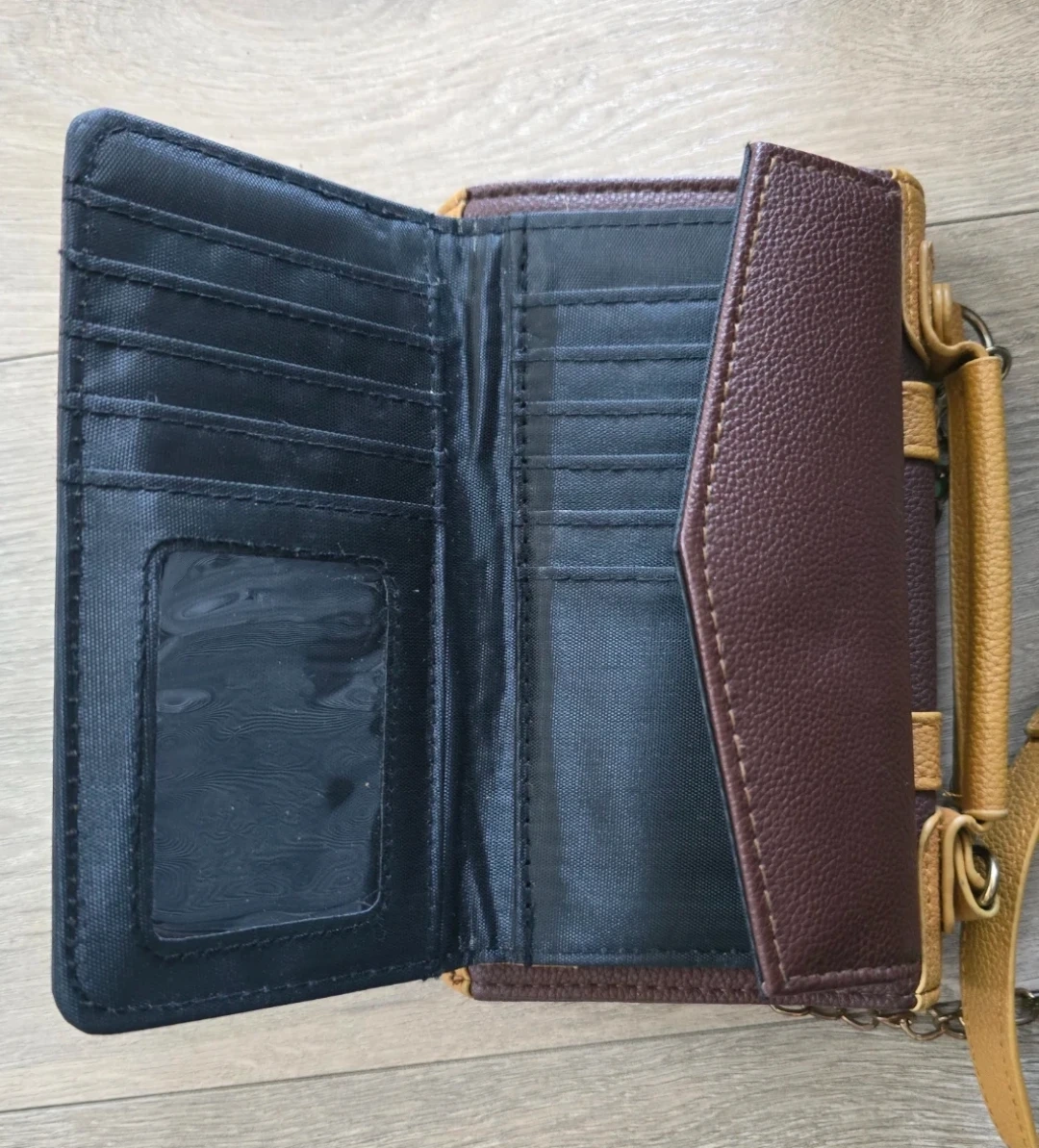 Harry Potter themed wallet from Claire's. It's brown and tan with patches and a chain strap. Includes multiple card slots and a clear ID window. Barely used