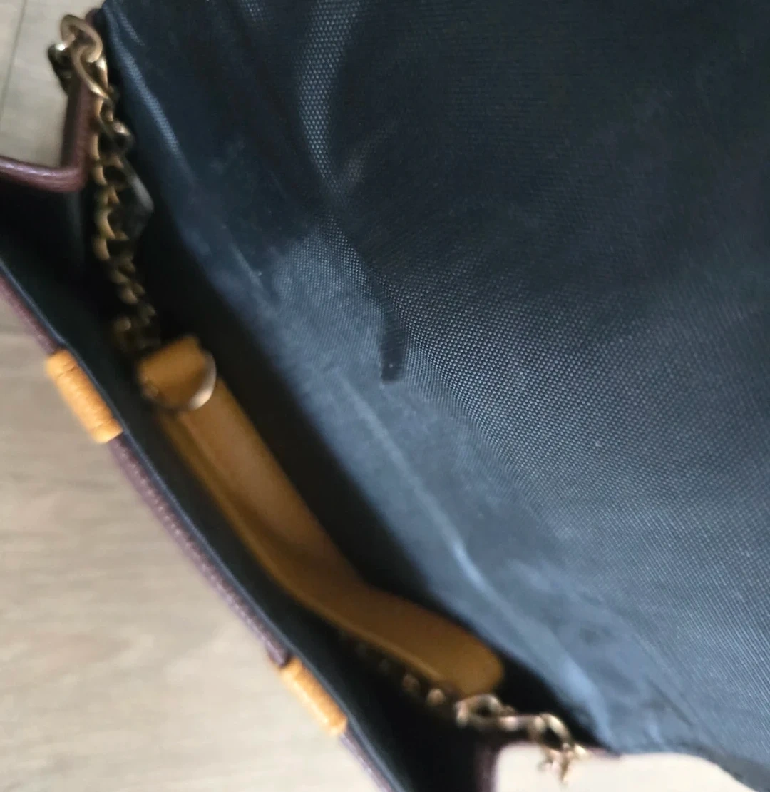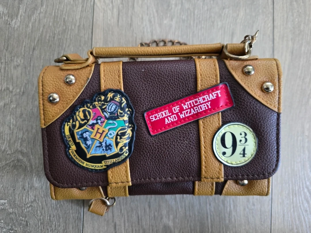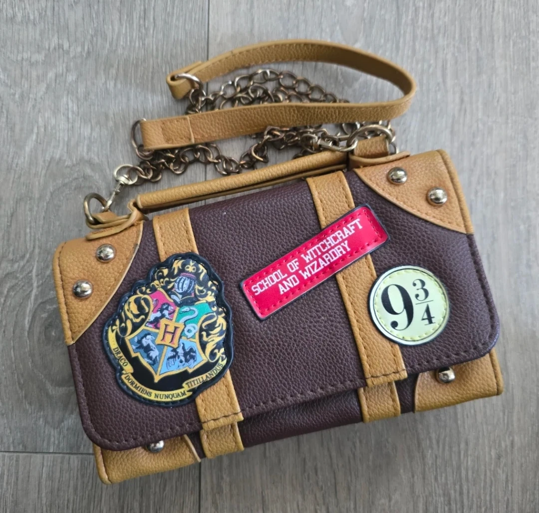 Harry Potter themed wallet from Claire's. It's brown and tan with patches and a chain strap. Includes multiple card slots and a clear ID window. Barely used