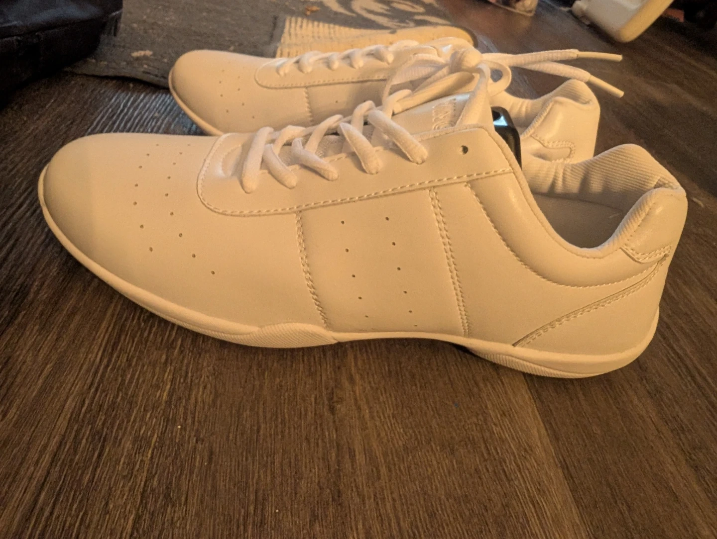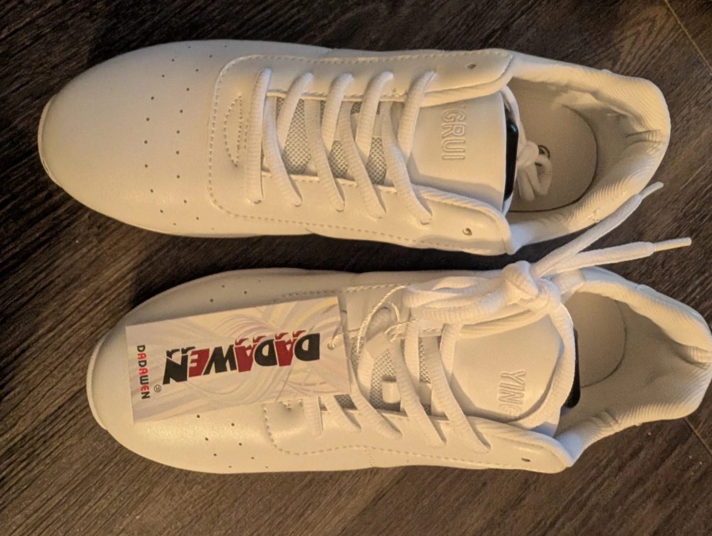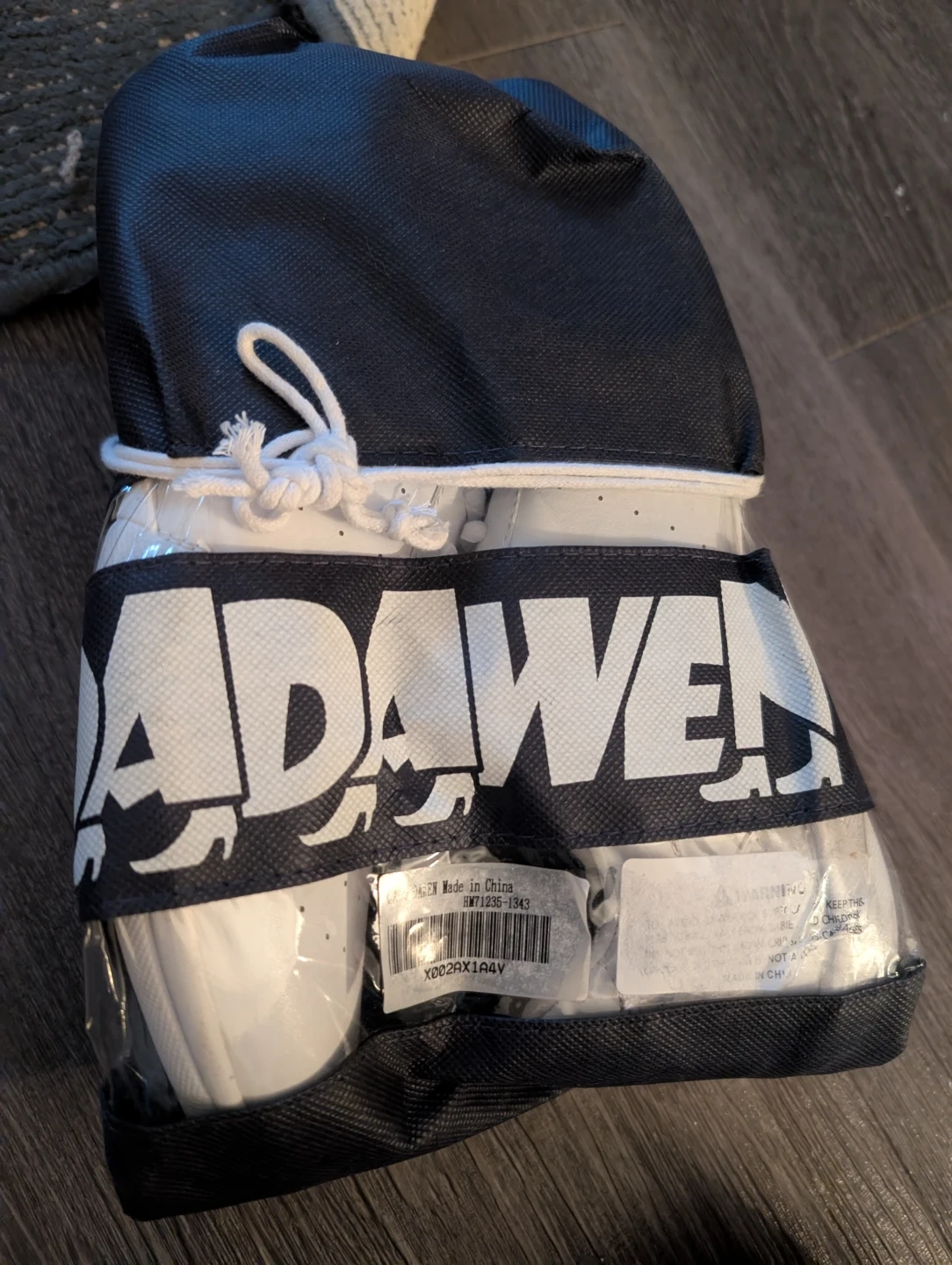 These DADWEN athletic shoes are white with lace-up closure. They're made of synthetic material and come with a drawstring bag. The shoes are lightweight and designed for performance