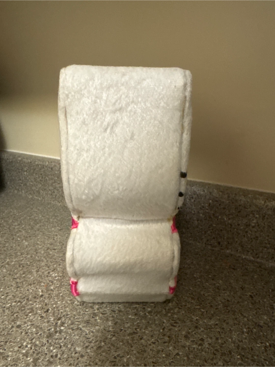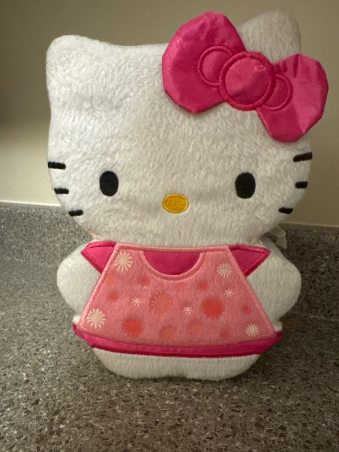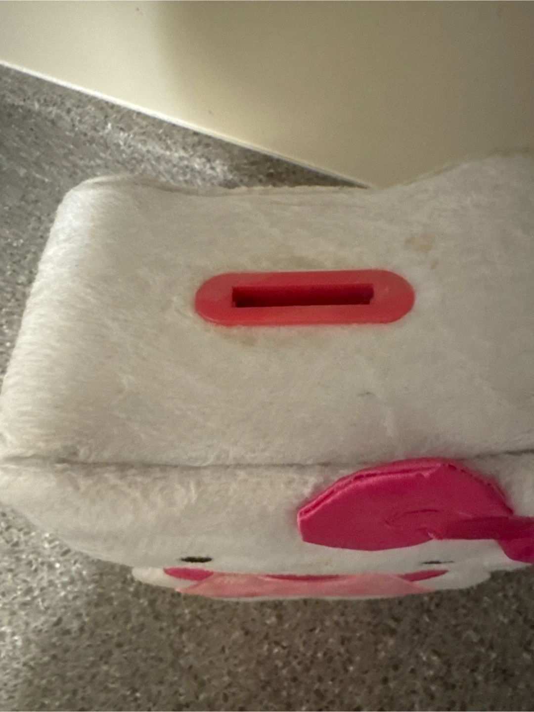 This adorable Hello Kitty plush coin bank is covered in soft white fur and features her classic pink bow. It has a slot on top for coins and is decorated with a cute pink dress. It's a fun way to save up spare change! It makes a sound when coin insert .