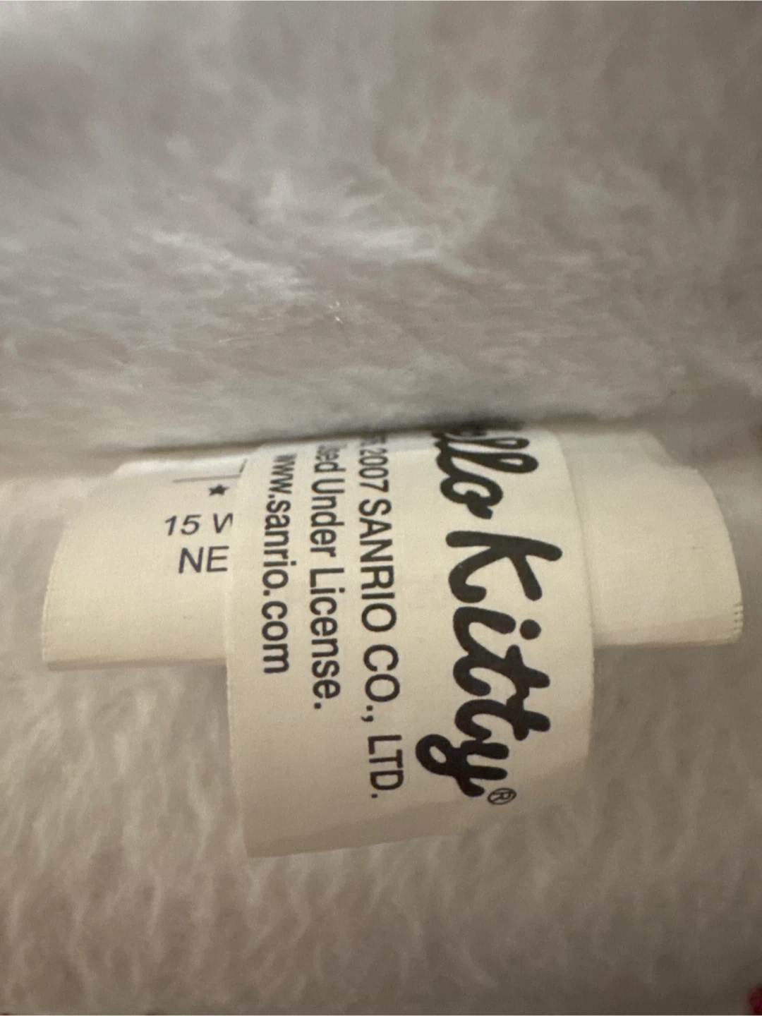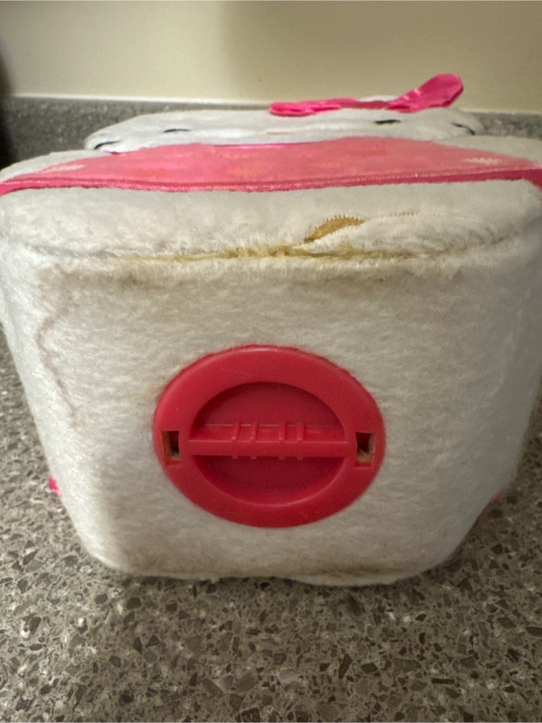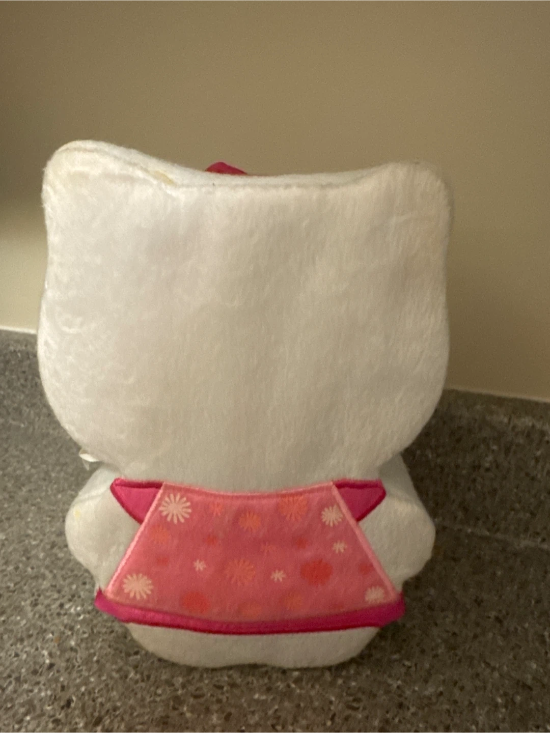 This adorable Hello Kitty plush coin bank is covered in soft white fur and features her classic pink bow. It has a slot on top for coins and is decorated with a cute pink dress. It's a fun way to save up spare change! It makes a sound when coin insert .