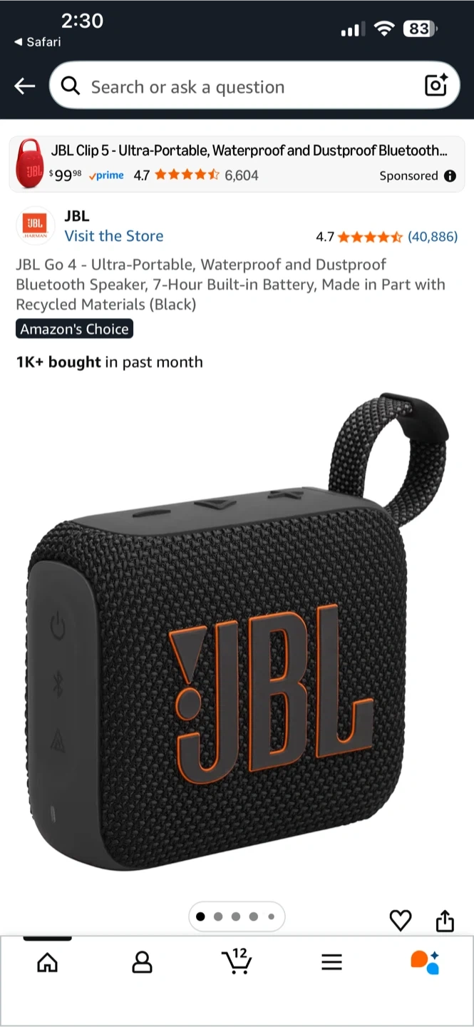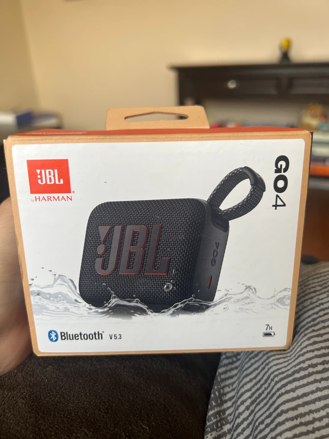 It's a JBL Go 4 portable Bluetooth speaker in black. It's waterproof and dustproof with a 7-hour battery life. Connects via Bluetooth v5.3.