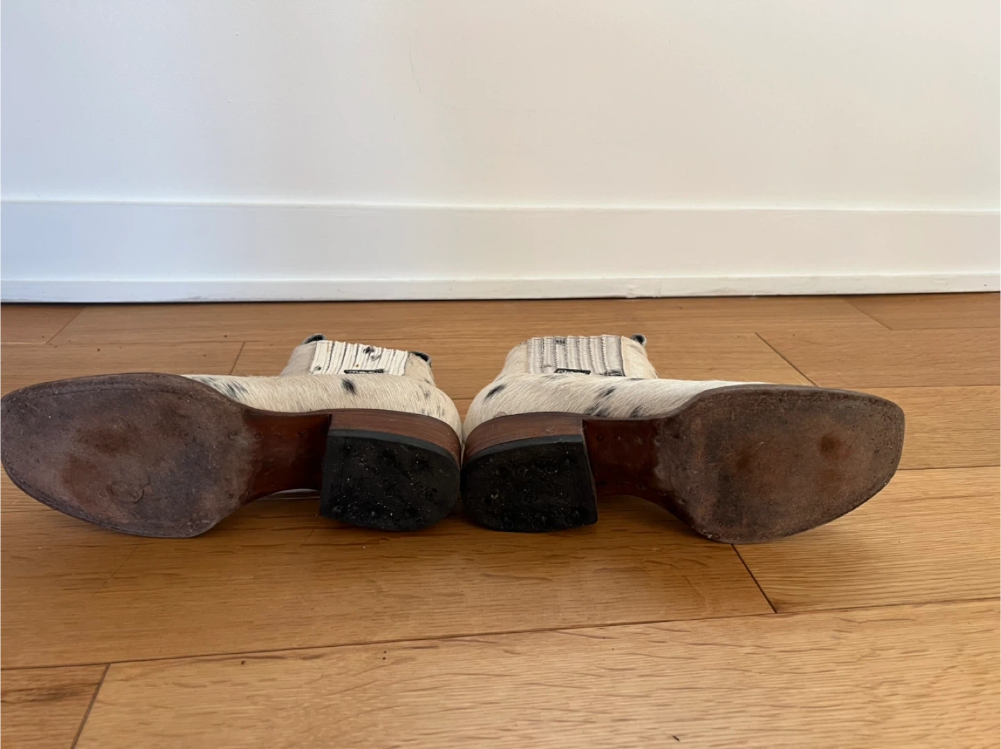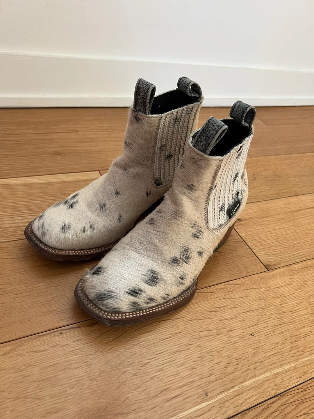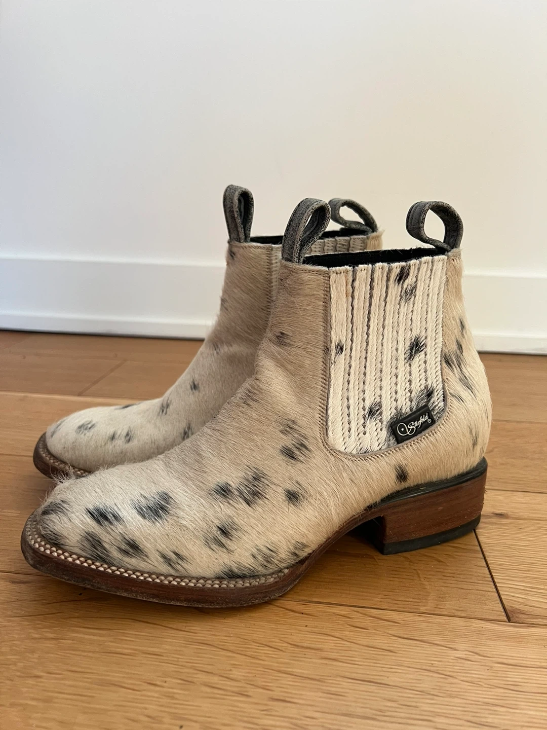 These Stiefeld ankle boots are made with genuine cowhide. Each pair is unique. In great condition, slight wear to the soles (see pics).