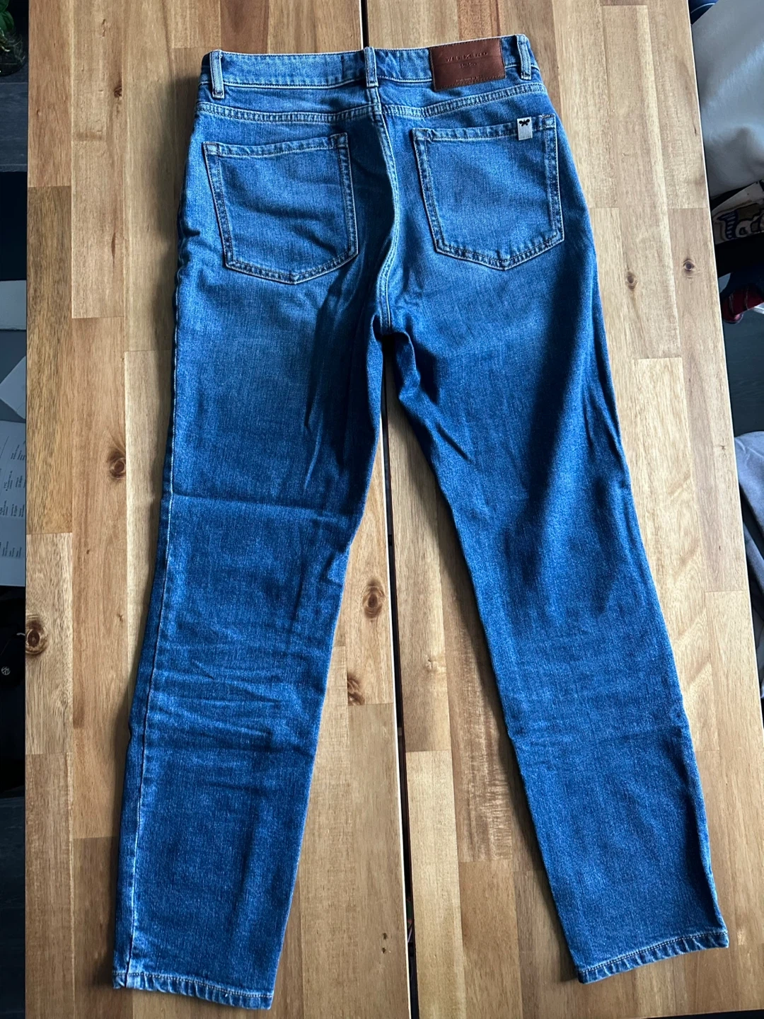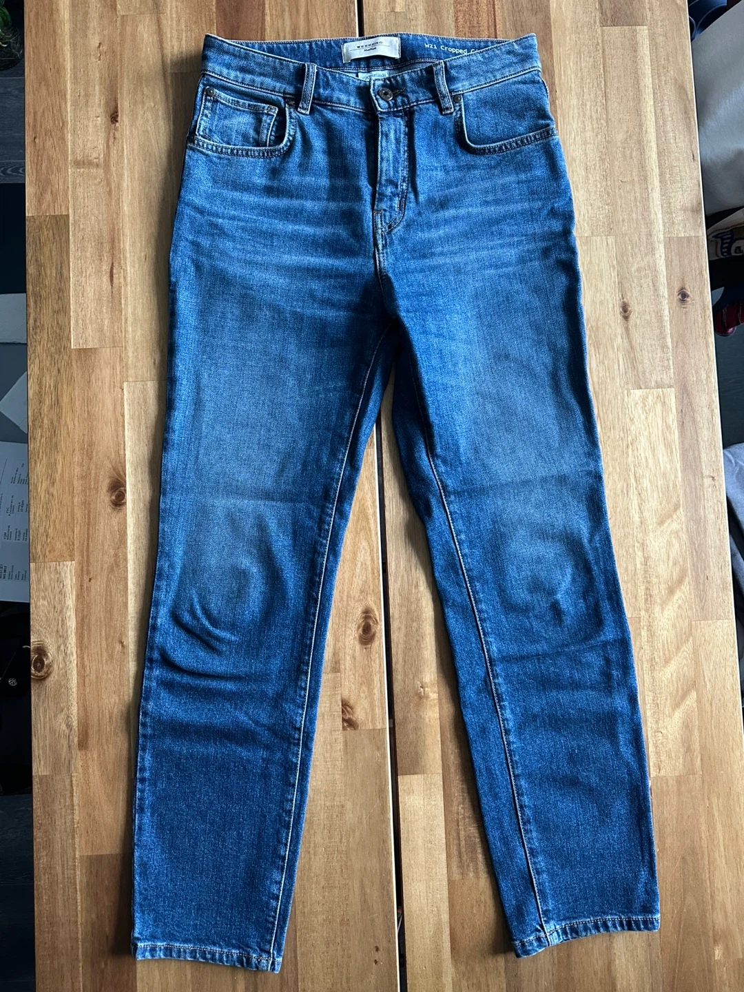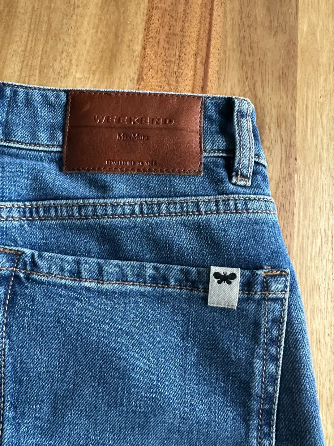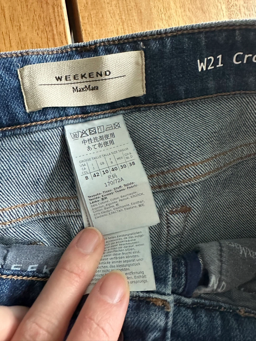 Weekend Max Mara W21 Cropped Cigarette Jeans in a size US 8. These mid-rise denim jeans are made from a cotton blend with elastane for stretch. They feature a classic five-pocket design with a button and zipper.