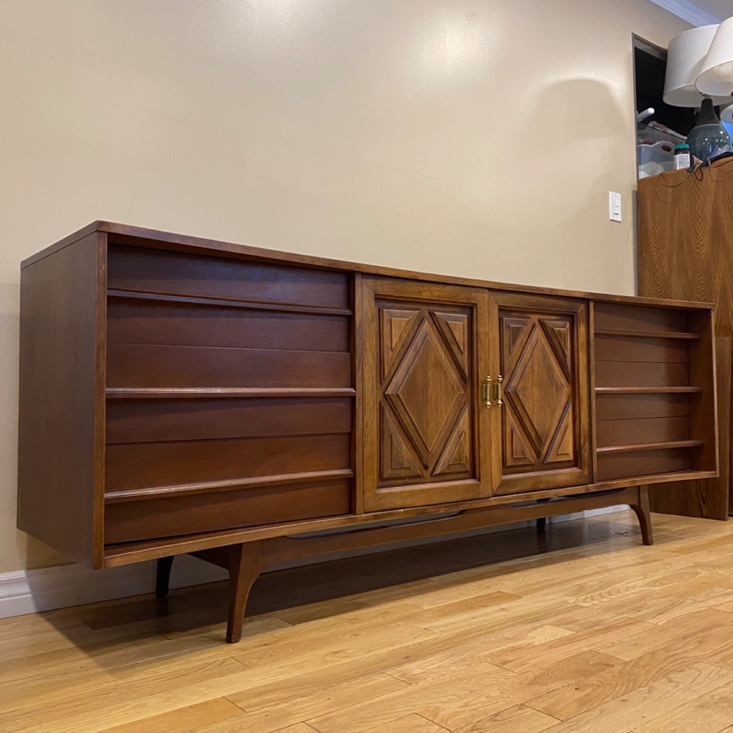 Stunning vintage mid-century modern walnut dresser with a long, low profile and beautiful architectural geometric door details. A high-quality, well-built piece from the 1950s–60s that works perfectly as a dresser, credenza, or media console.