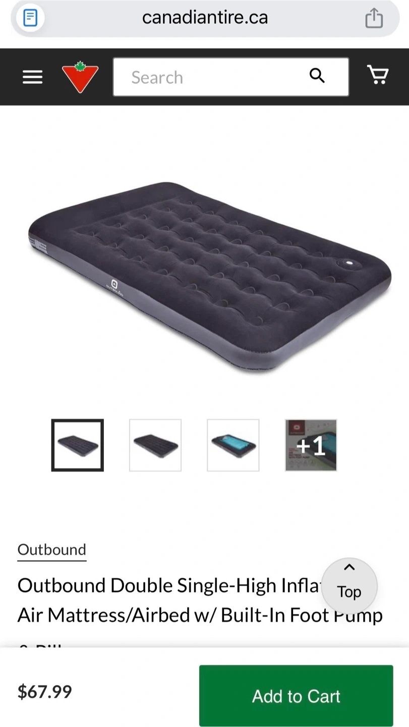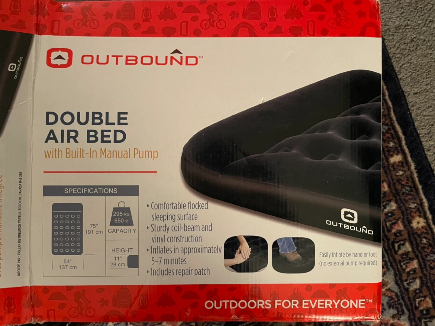 Like new and includes the box. Box was opened. Outbound size Double Air Bed with a built-in manual pump. Features a comfortable flocked sleeping surface and sturdy coil-beam construction. Inflates in approximately 5-7 minutes and includes a repair patch. Dimensions: 75" L x 54" W x 7" H.