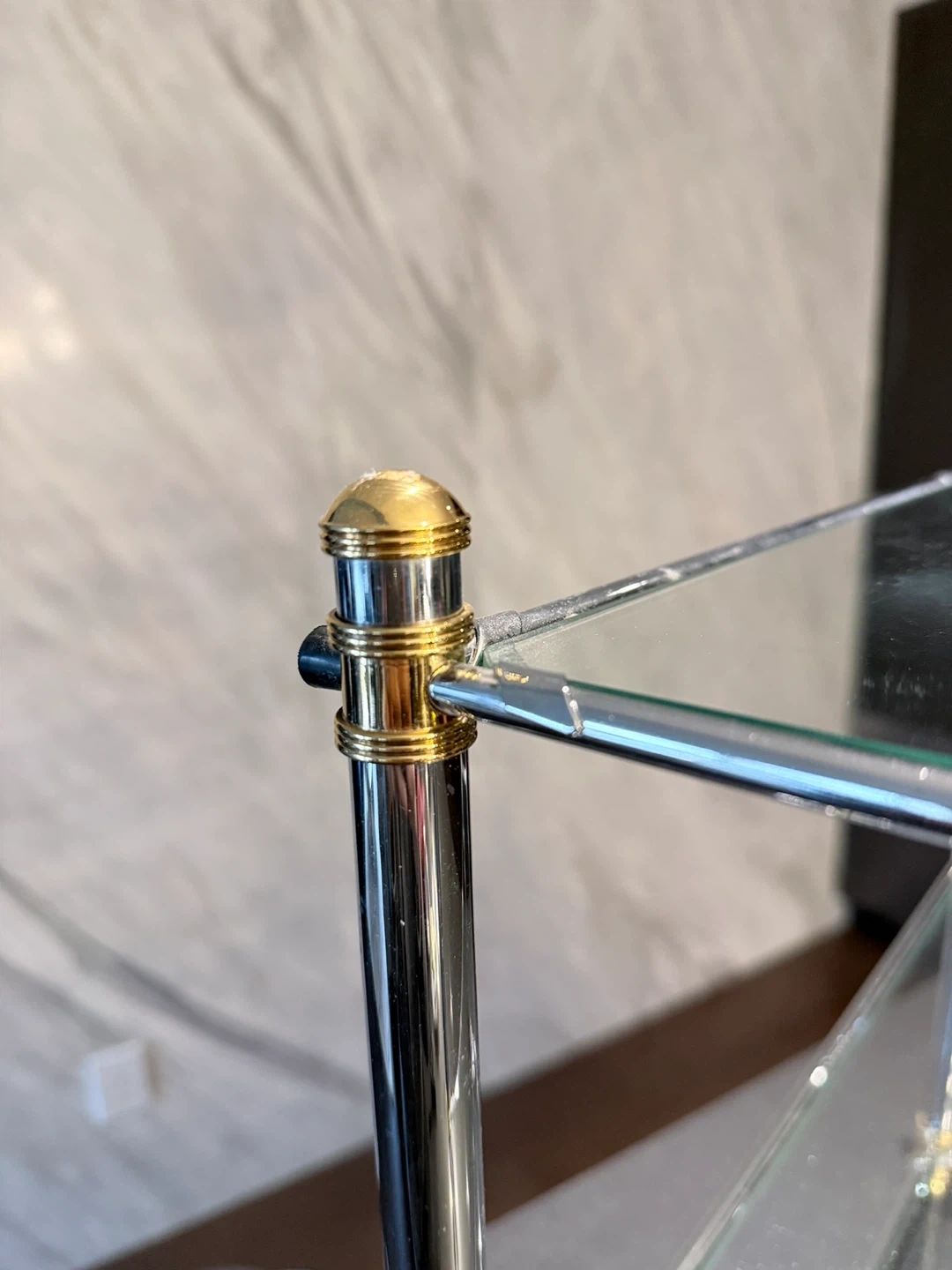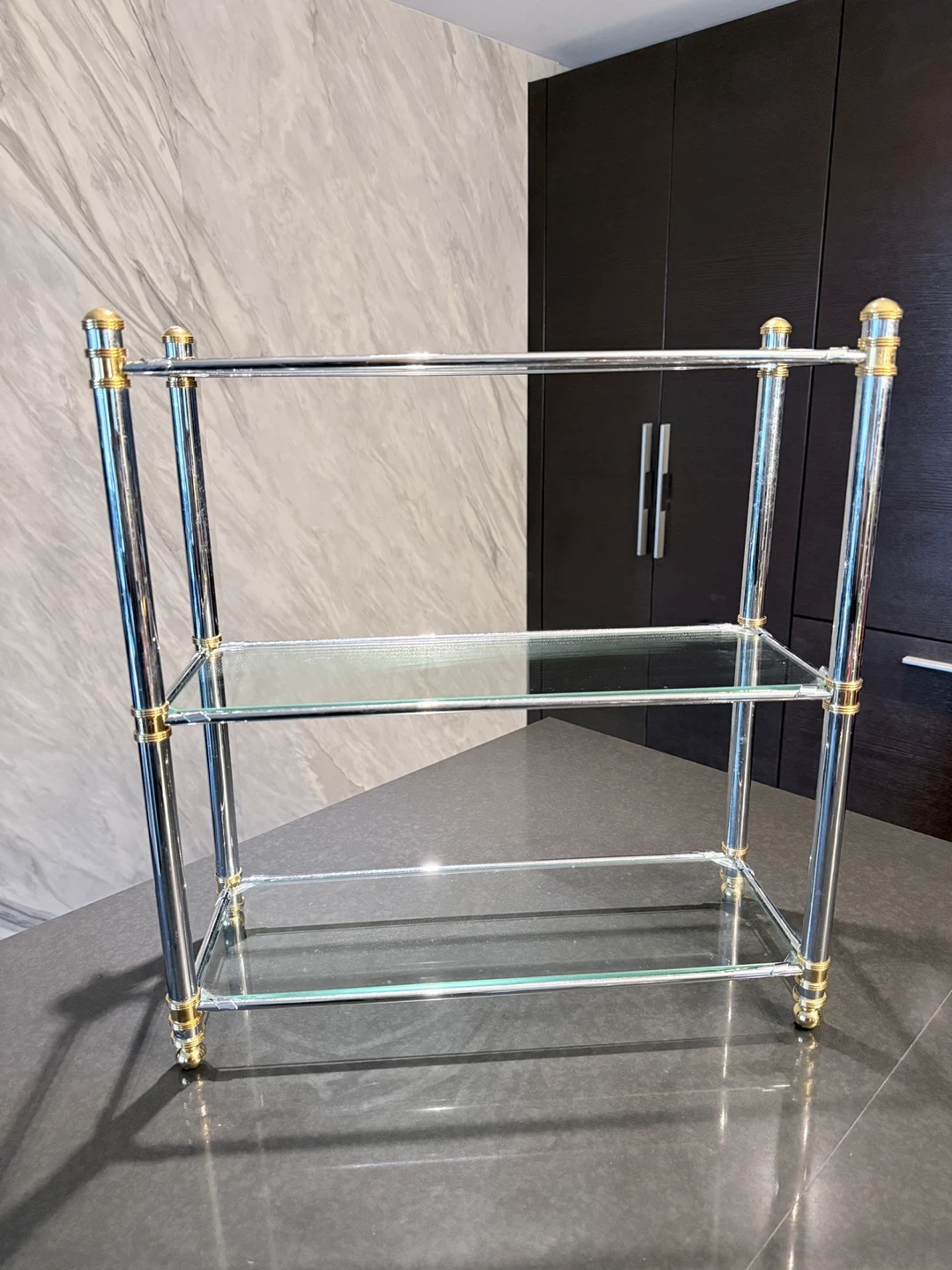 High quality three-tier shelf. Chrome metal frame with gold accents. Glass shelves. Easy to assemble, great quality. Store in Storage for over 5 years, all gold colour stay, great quality. Approximately 18 inches wide and 20 inches tall.