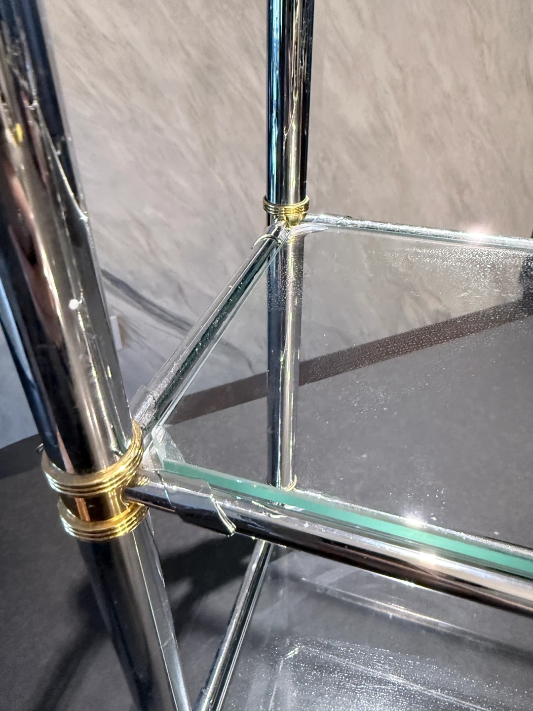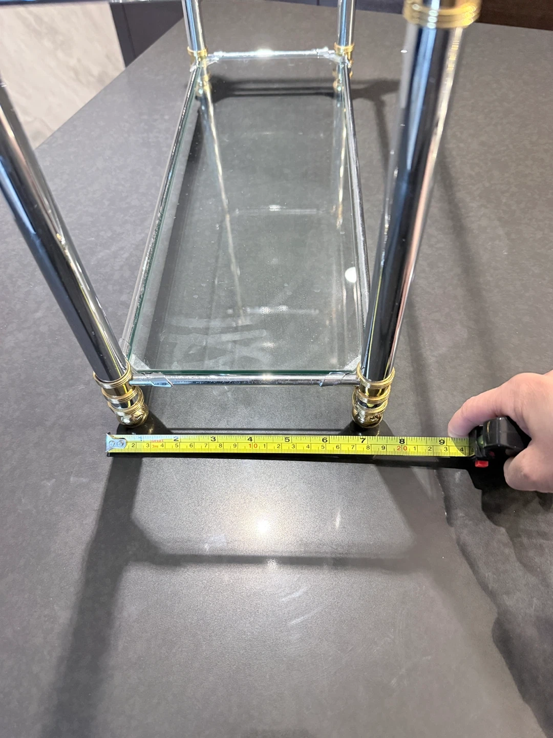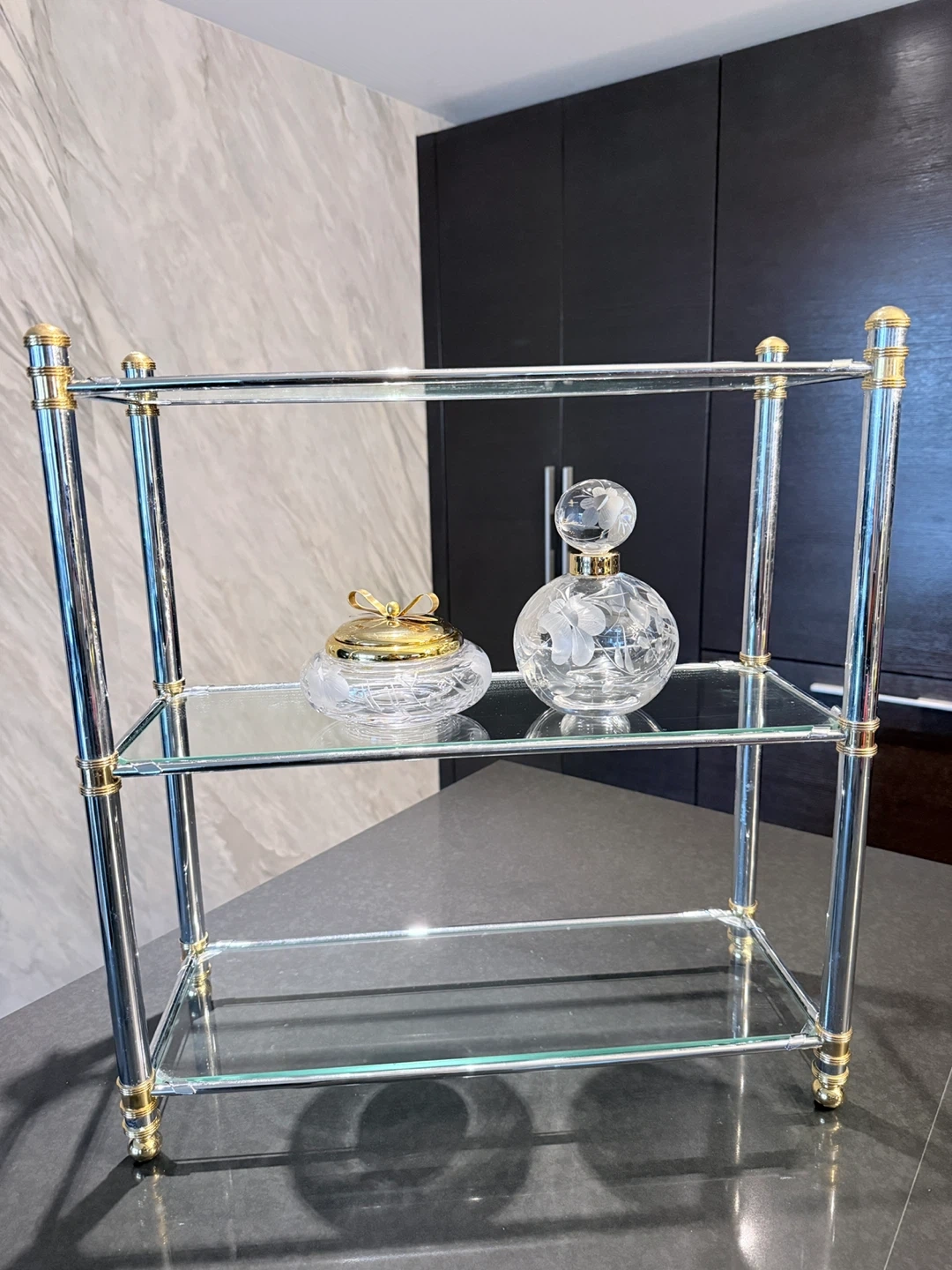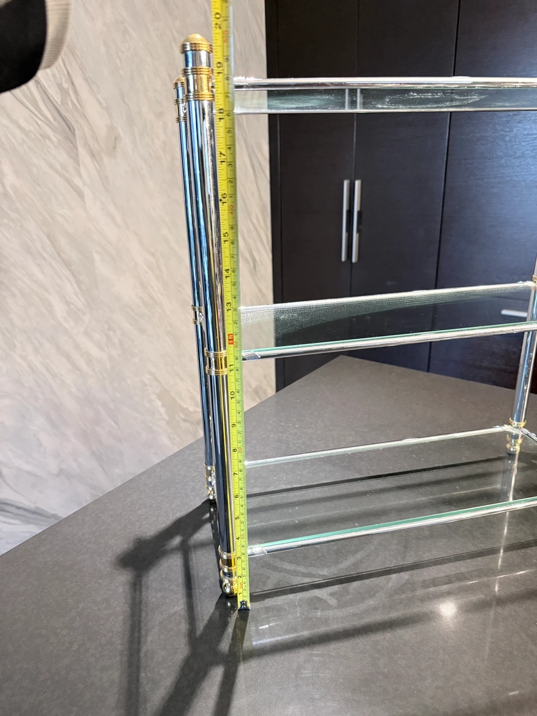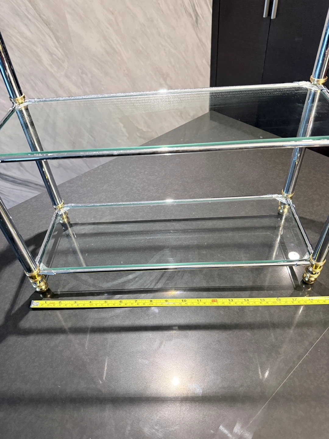 High quality three-tier shelf. Chrome metal frame with gold accents. Glass shelves. Easy to assemble, great quality. Store in Storage for over 5 years, all gold colour stay, great quality. Approximately 18 inches wide and 20 inches tall.