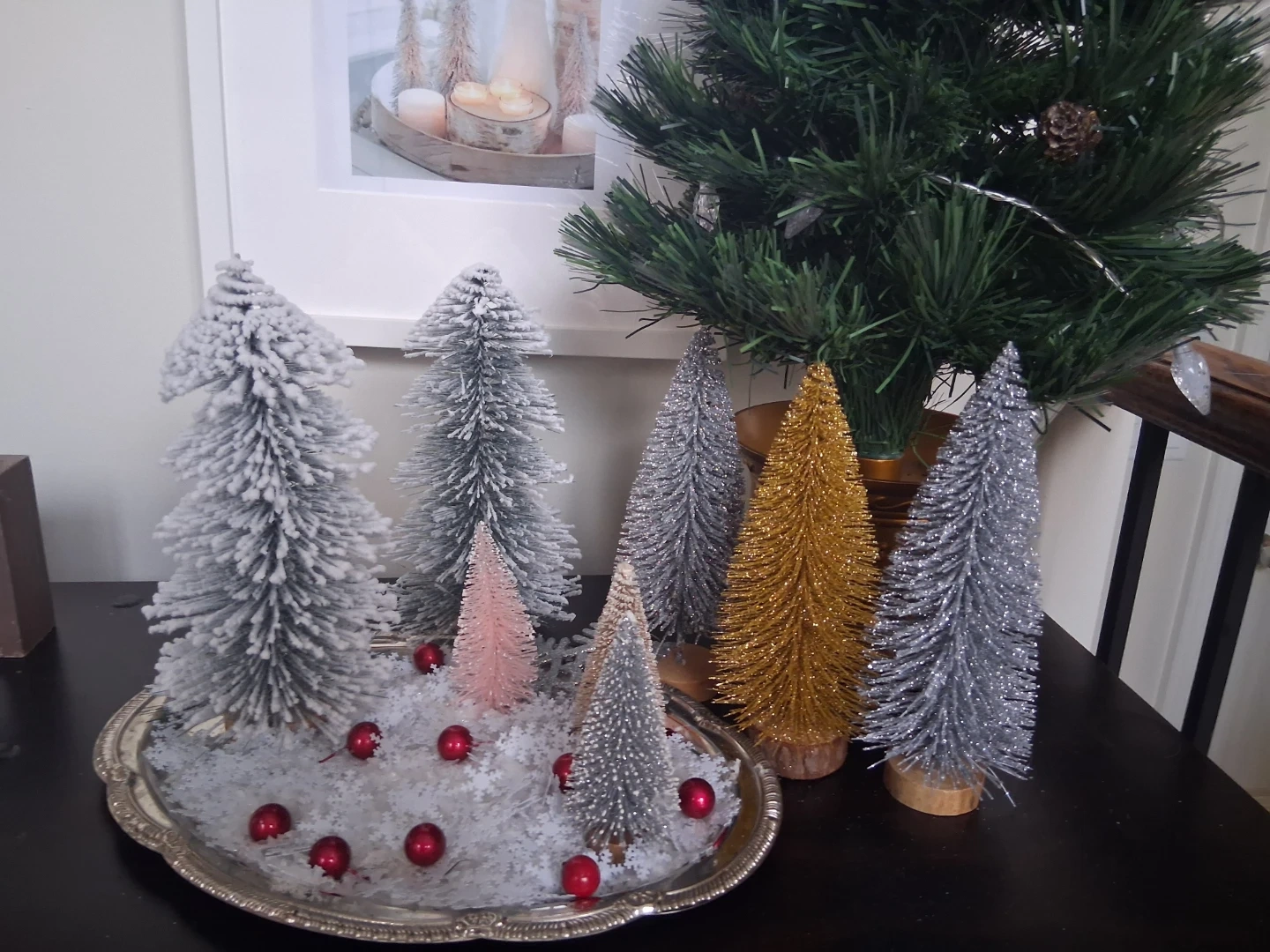 This set includes nine decorative miniature Christmas trees in various sizes and finishes. Includes frosted, glittered silver, and gold trees, plus a blush pink one. Perfect for creating a festive holiday display or a charming winter scene.