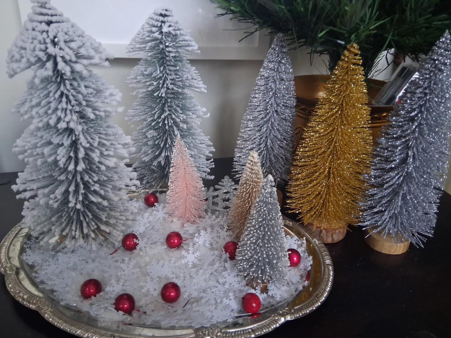 This set includes nine decorative miniature Christmas trees in various sizes and finishes. Includes frosted, glittered silver, and gold trees, plus a blush pink one. Perfect for creating a festive holiday display or a charming winter scene.