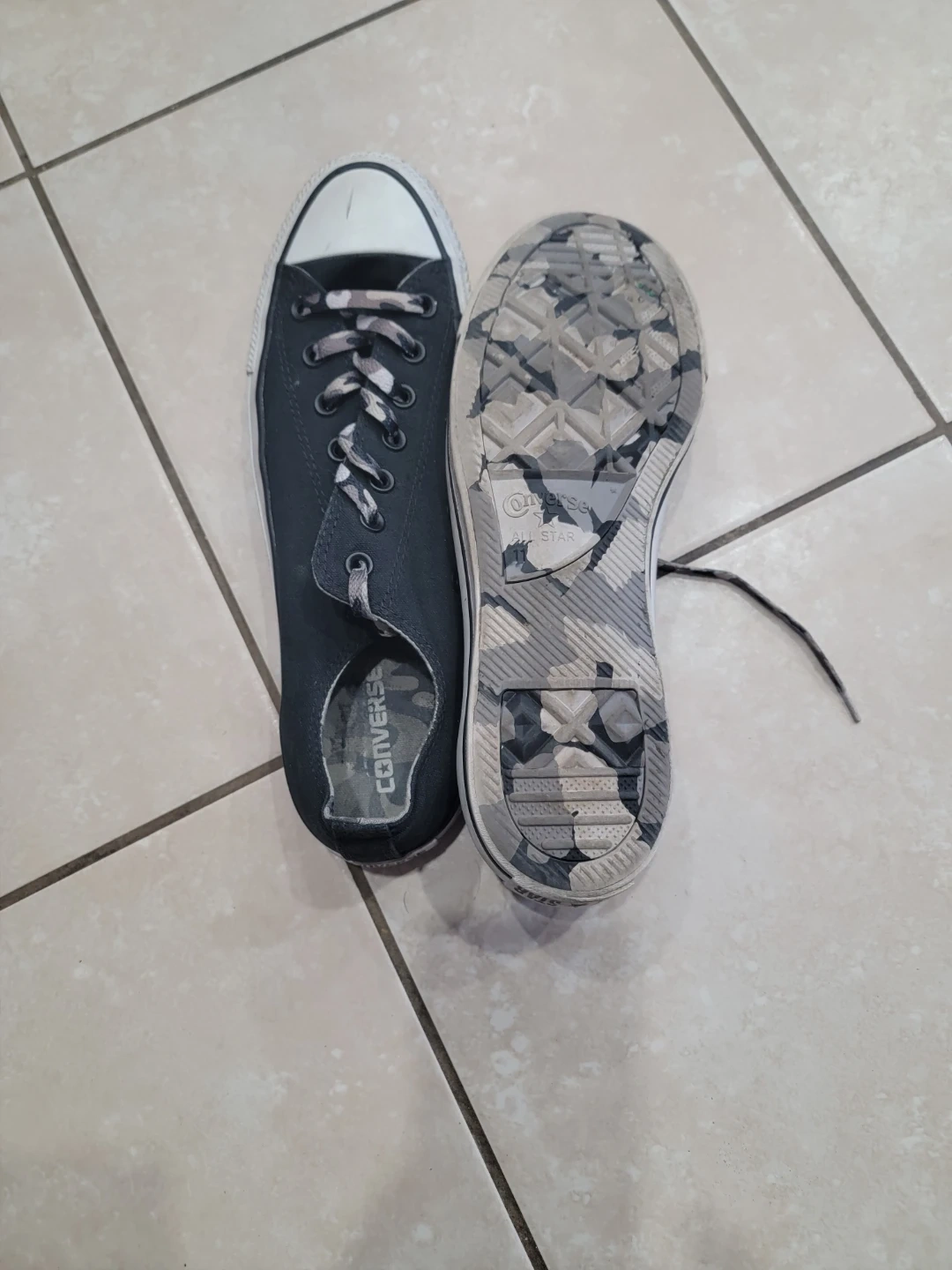Classic Converse Chuck Taylor All Star shoes. They're black with a camouflage-patterned inner lining and sole. Lace-up closure.