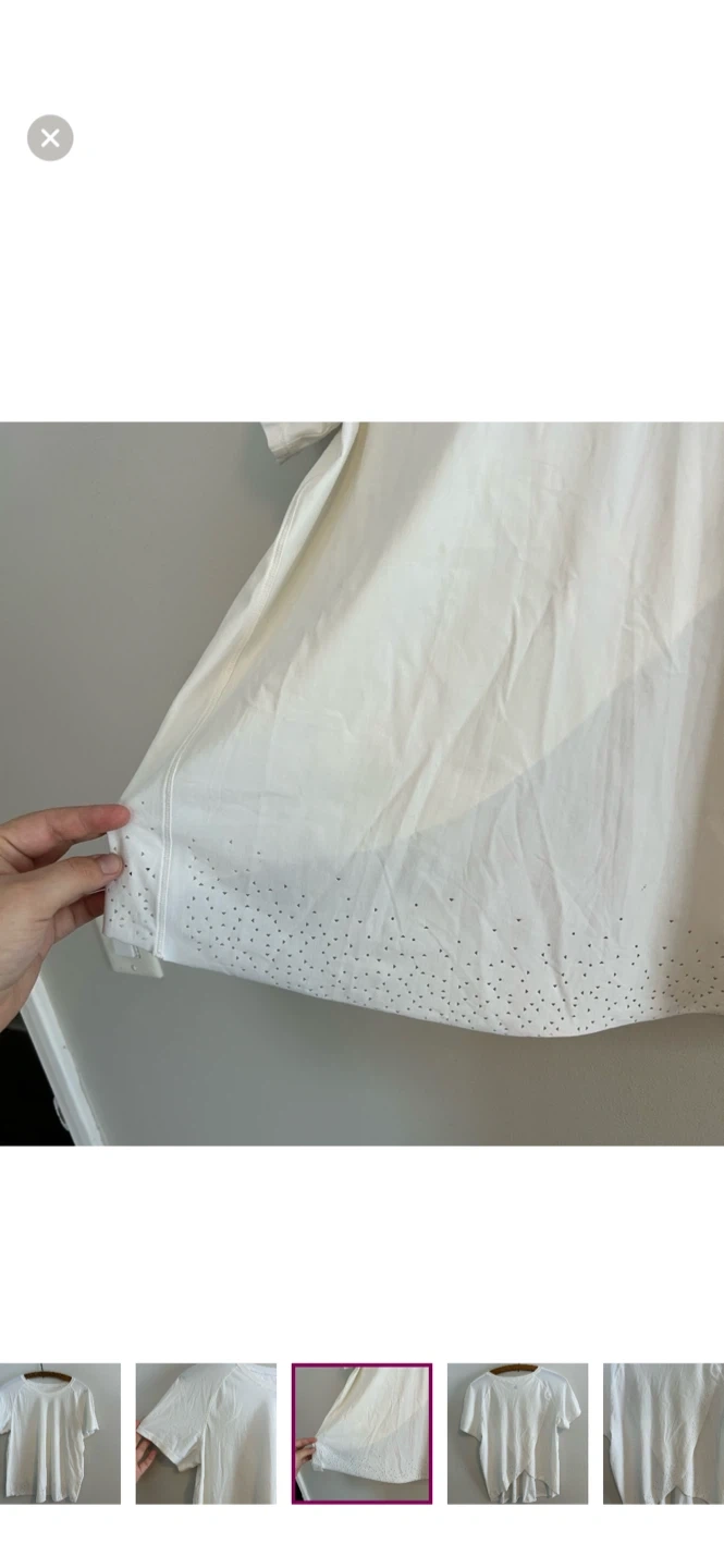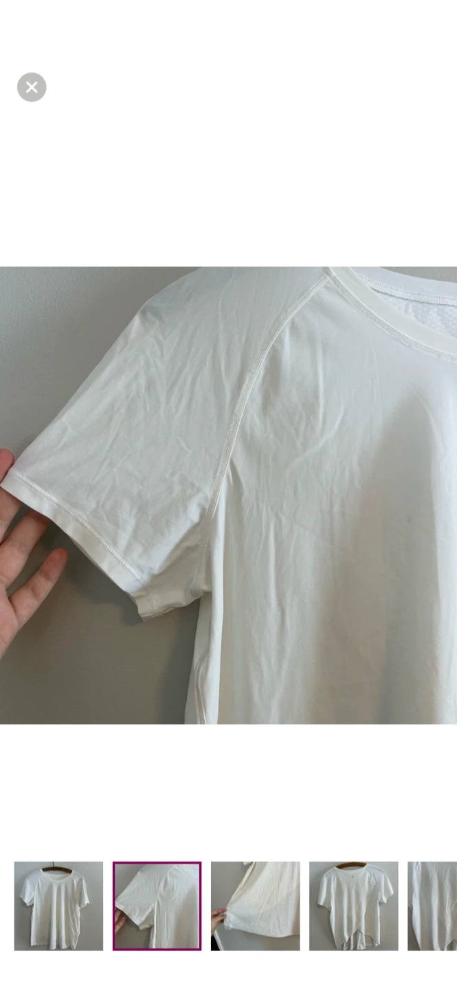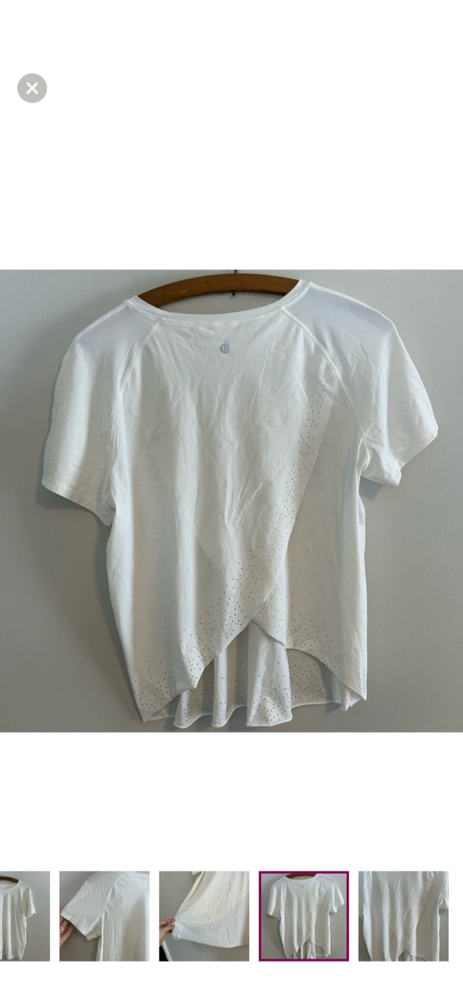 Lululemon brand. Short sleeve curved open back top. White with cutout hem. No size dot, fits like a medium. Pit to pit 17.5” but with open back could fit smaller/bigger. Brand new condition