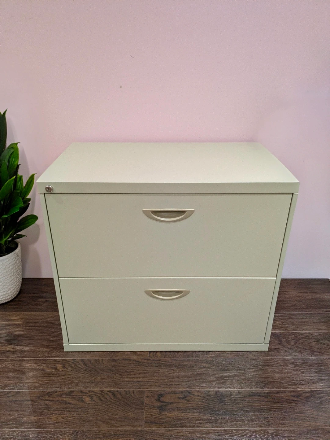 This is a two-drawer metal filing cabinet. It's a light beige colour and has simple pull handles. It comes with a lock and key for security. Filing drawers like this are handy for home offices or small businesses!