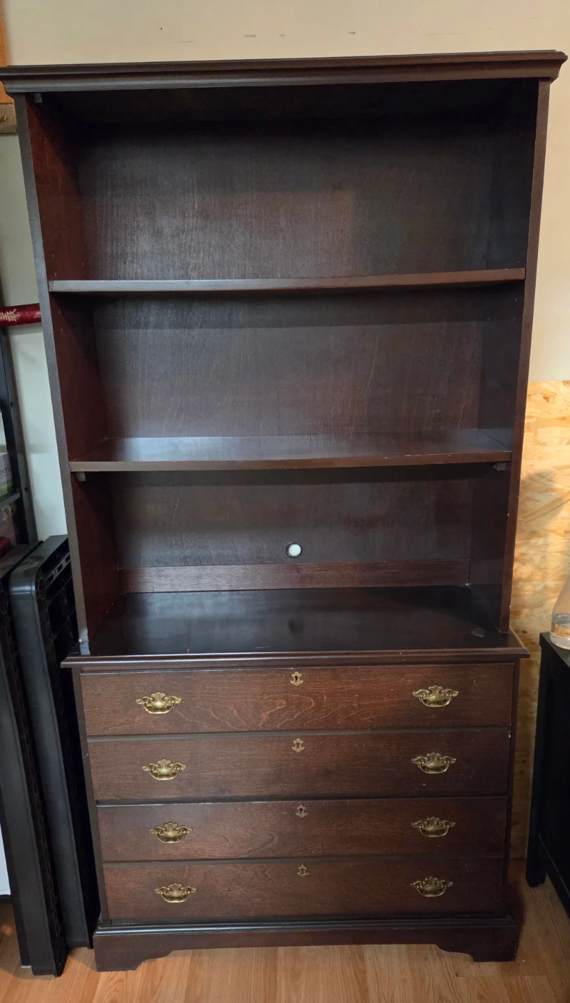 A dark wood bookcase featuring three shelves and 2 large drawers at the base. Brass-toned hardware adorns the drawer fronts. It cones in 2 pieces and is heavy.