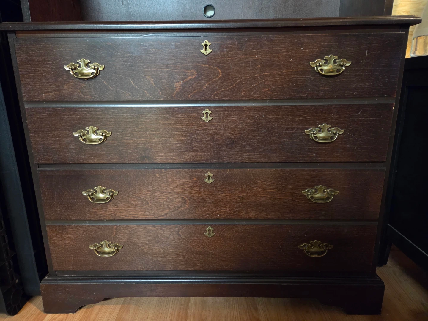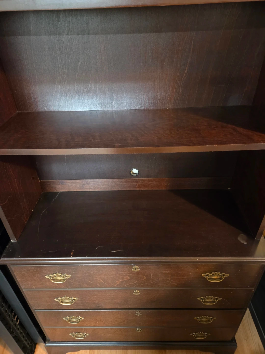 A dark wood bookcase featuring three shelves and 2 large drawers at the base. Brass-toned hardware adorns the drawer fronts. It cones in 2 pieces and is heavy.