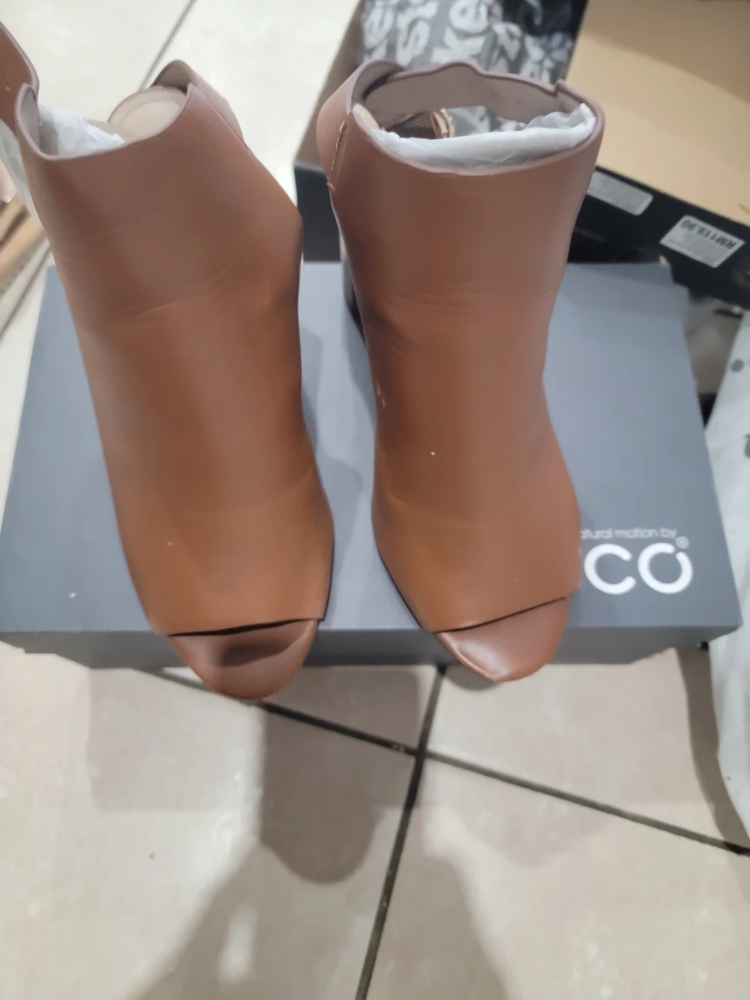 Stylish brown leather peep-toe heeled booties. These shoes feature a comfortable block heel and an open front design. They're perfect for dressing up any outfit!