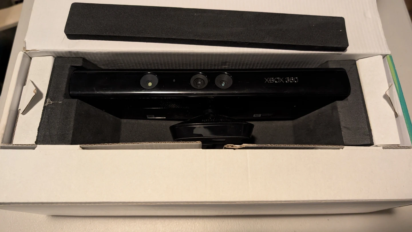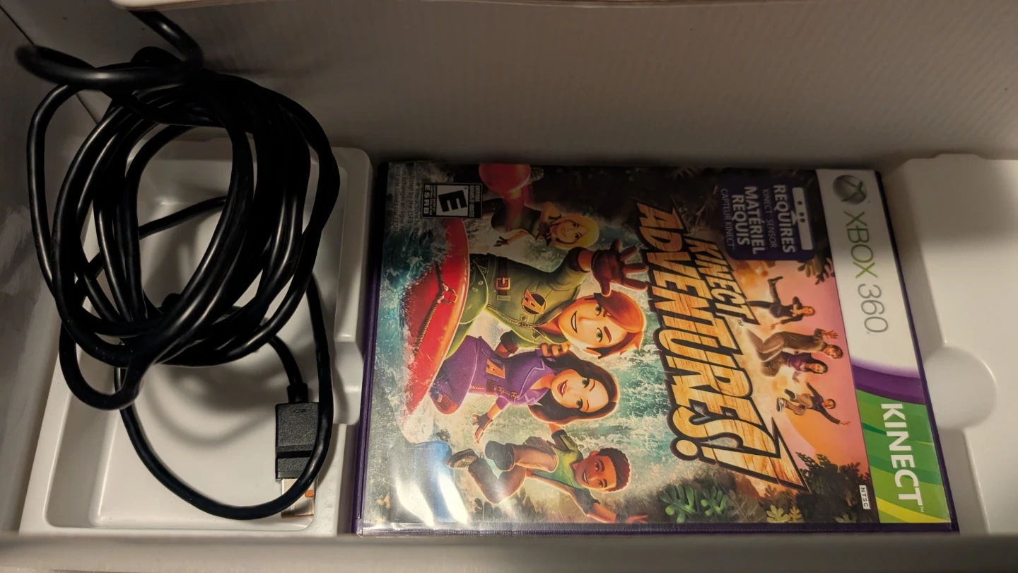 This is an Xbox 360 Kinect sensor with the Kinect Adventures game included. It comes with the sensor, the game, and the necessary cables and power adapter. It's in the original box.