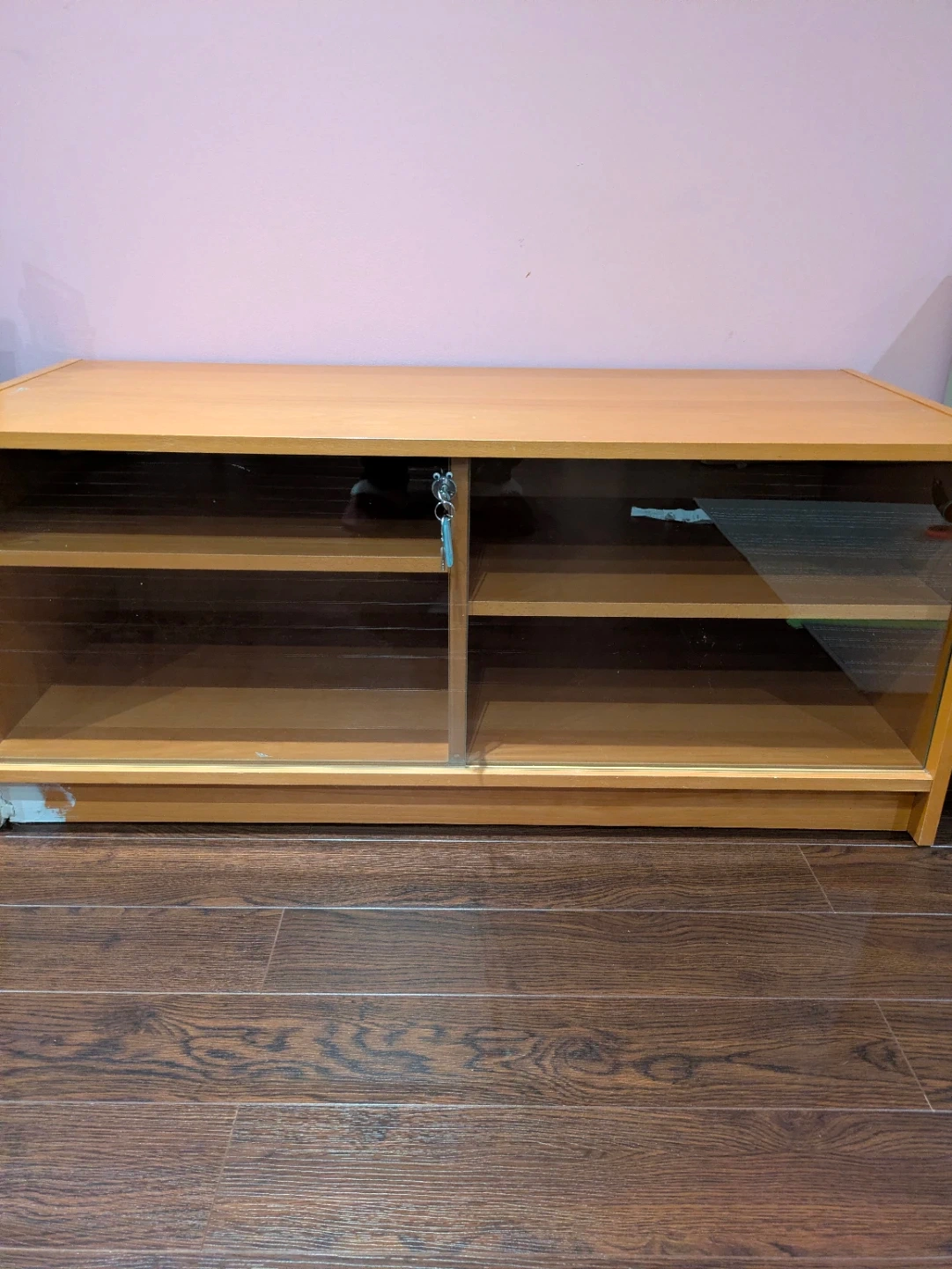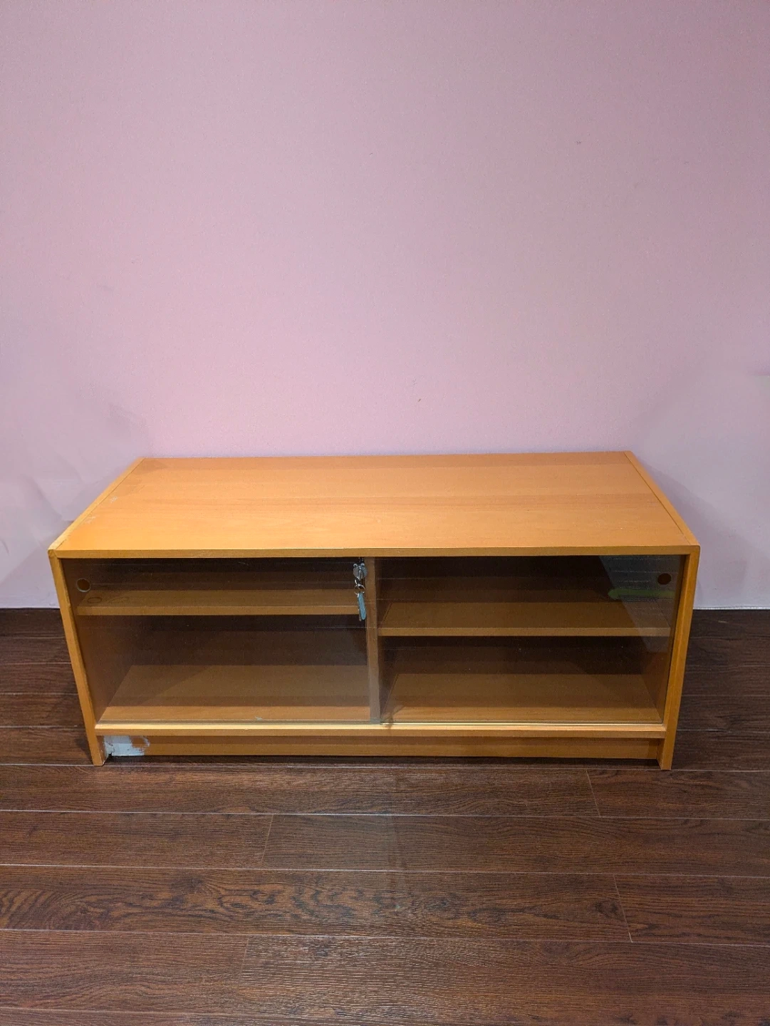 A simple entertainment cabinet with a light wood finish. It features two open shelves with two adjustable shelves behind sliding glass doors. Some minor repair work visible at the base of the unit. This cabinet would be useful for storing media equipment or as a general storage unit.