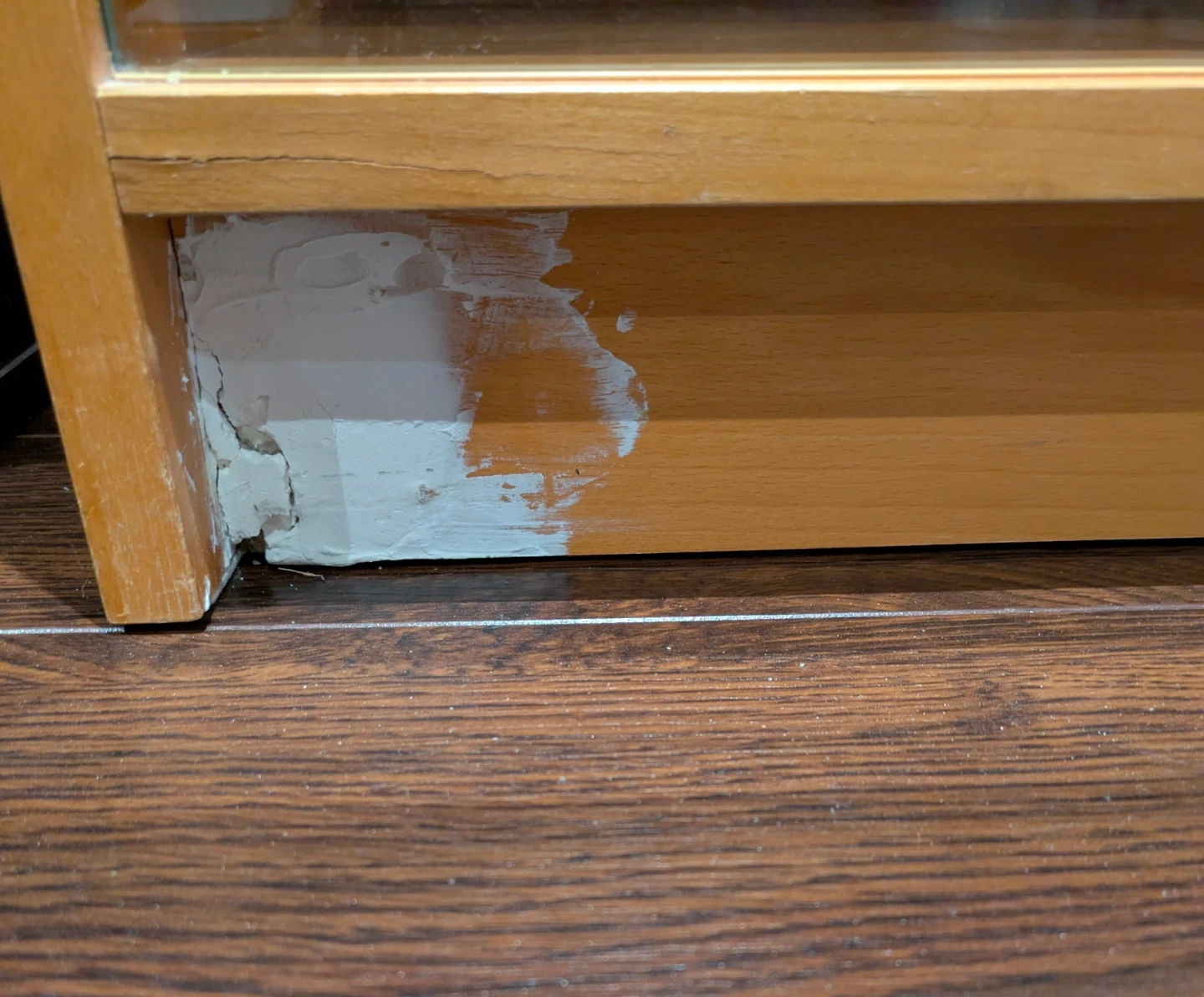 A simple entertainment cabinet with a light wood finish. It features two open shelves with two adjustable shelves behind sliding glass doors. Some minor repair work visible at the base of the unit. This cabinet would be useful for storing media equipment or as a general storage unit.