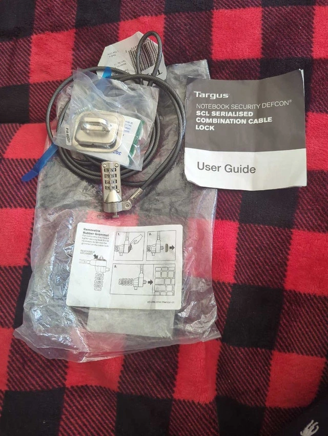 This Targus Notebook Security Defcon SCL Serialized Combination Cable Lock is designed to protect your laptop with a sturdy combination lock and cable. The item is new, unused, and includes the original packaging and user guide. Brand: Targus. Model: Defcon SCL. Type: Combination Cable Lock. Asking $20.