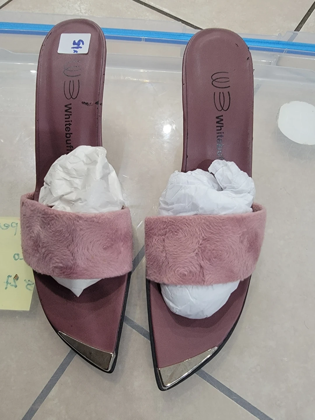 Pink slip-on slides with a faux fur strap and metal toe cap detail. Heel height is approximately 3 inches. Perfect for adding a touch of style to your casual outfits!