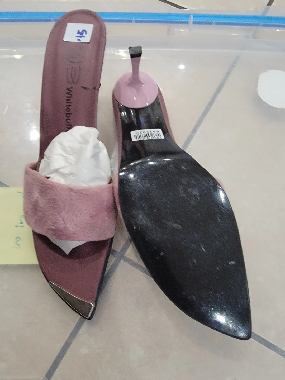 Pink slip-on slides with a faux fur strap and metal toe cap detail. Heel height is approximately 3 inches. Perfect for adding a touch of style to your casual outfits!