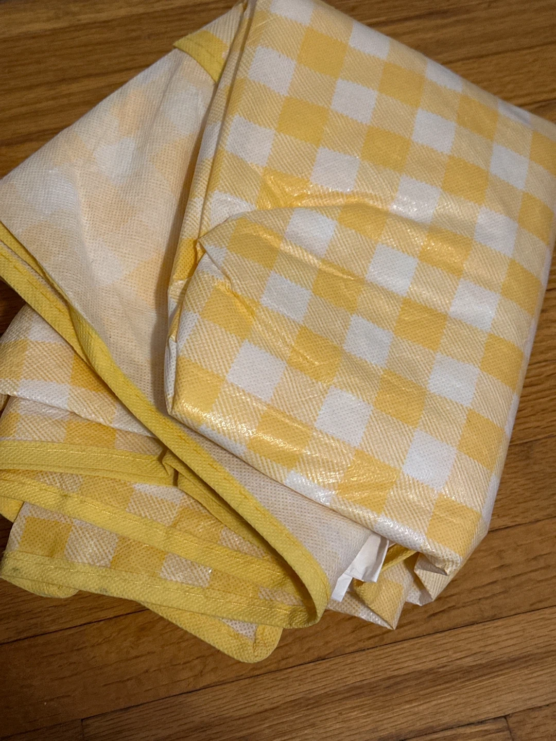 This is a yellow and white checkered picnic blanket. It's made of a durable, woven material. It's great for outdoor gatherings or as a ground cover. It folds up for easy transport!