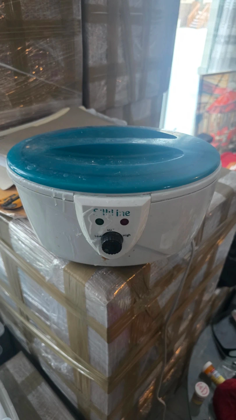 Spa salon wax heater with adjustable temperature settings. It's a handy device for salons or home use. The container is white with a blue lid.