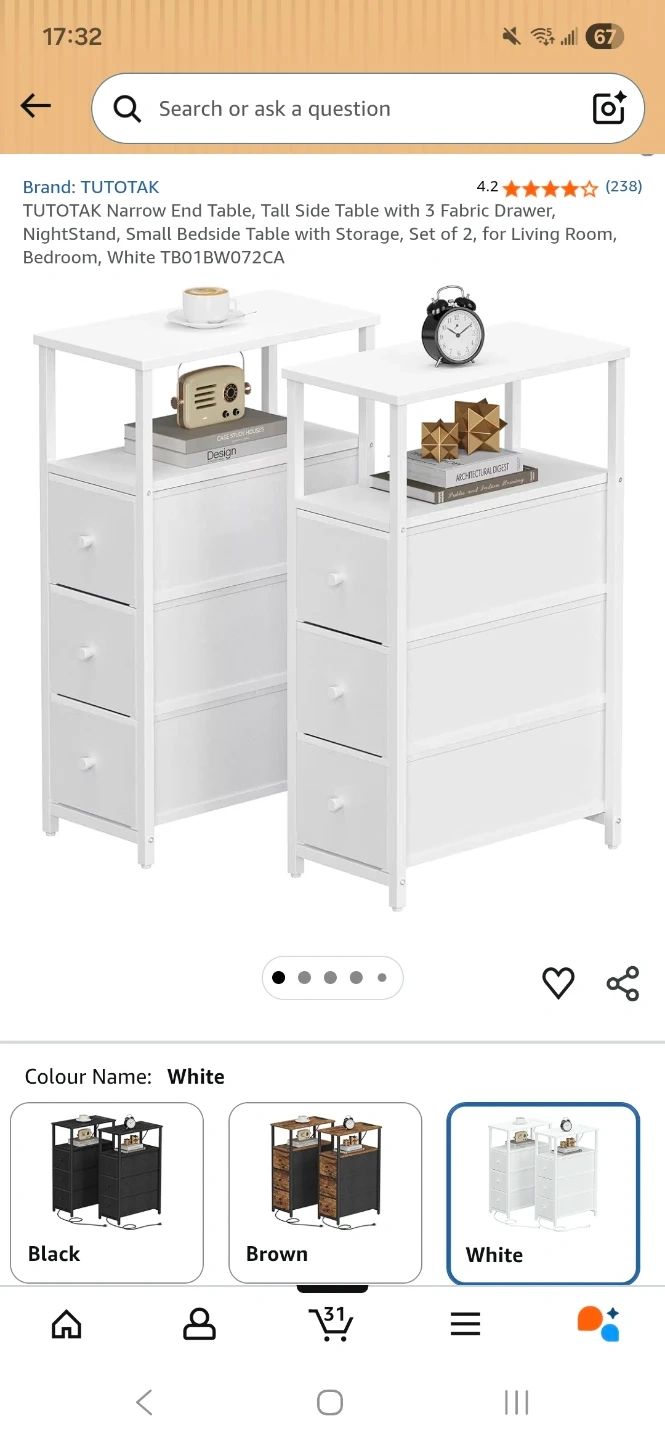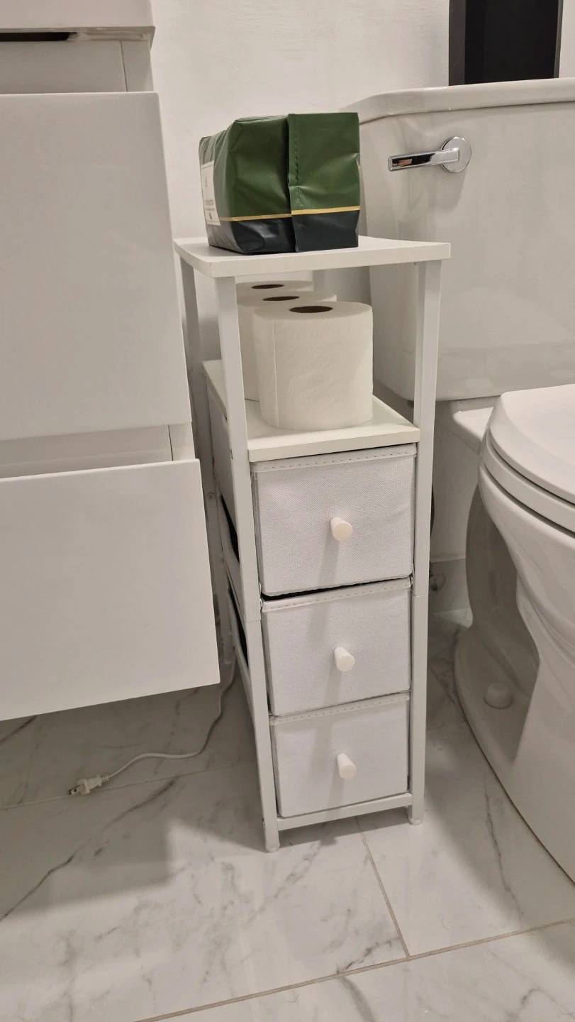This TUTOTAK narrow end table is white and comes with three fabric drawers for storage. It's a tall side table designed for living rooms, bedroom or bathroom.