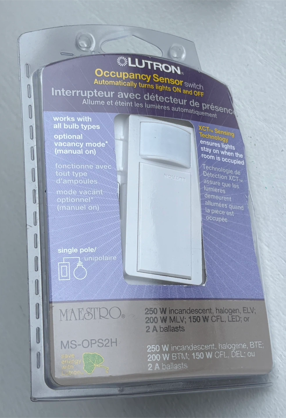 This Lutron Maestro occupancy sensor switch is designed to automatically turn lights on and off. It works with all bulb types and features optional vacancy mode. The switch supports 250 W incandescent, halogen, ELV, 200 W MLV, 150 W CFL, or LED. It includes wire nuts and a faceplate.