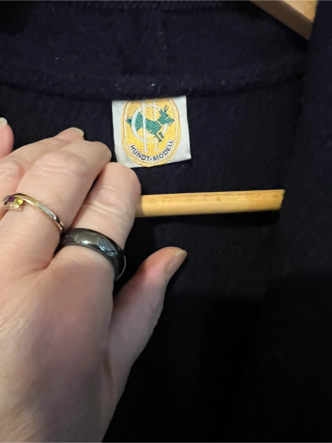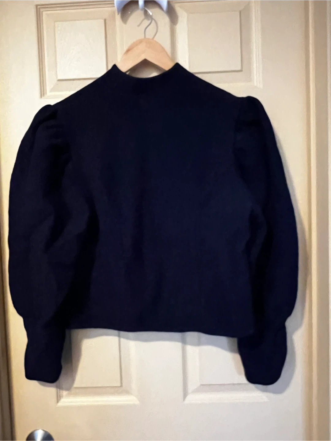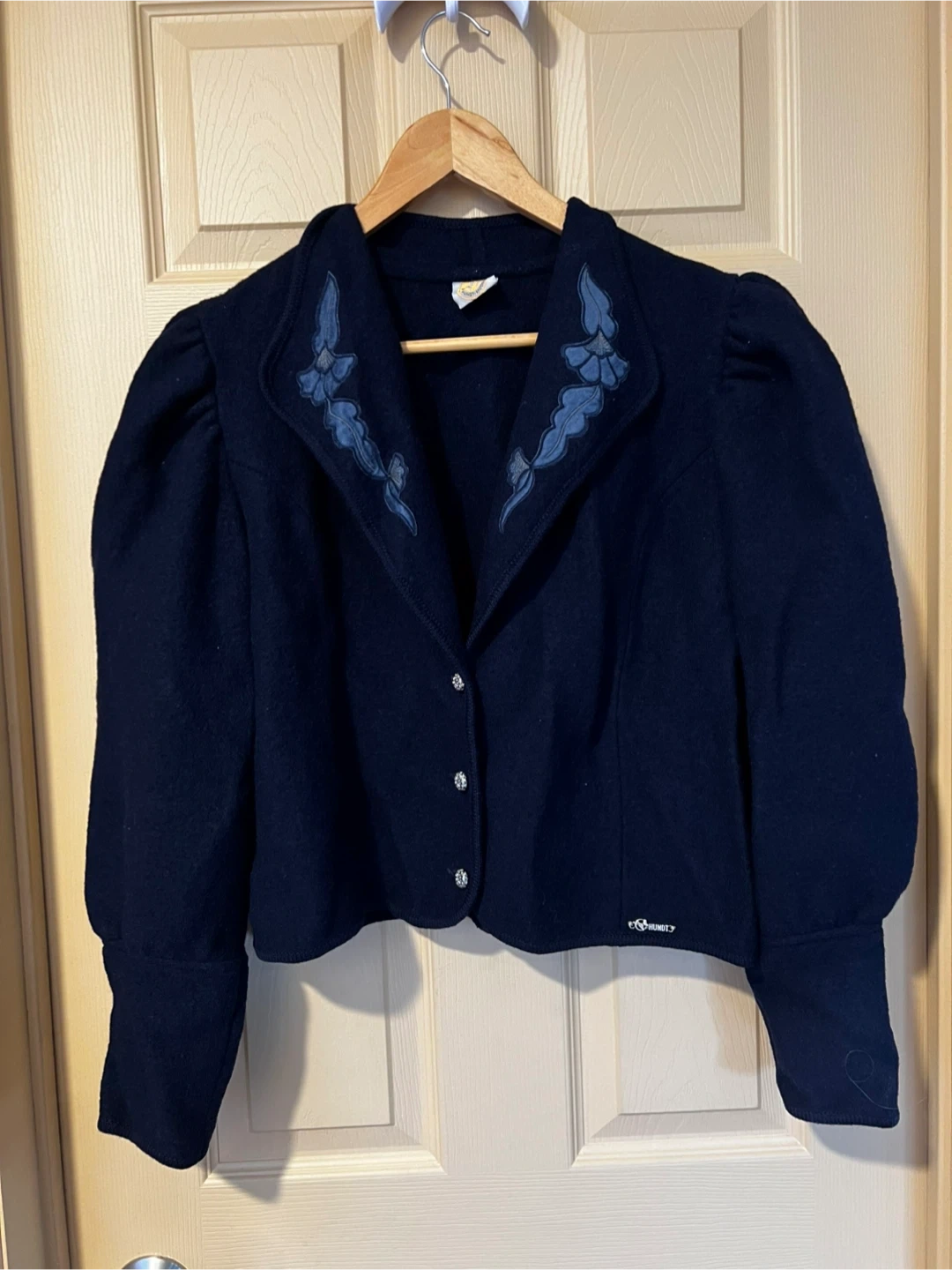This Hundt Modell blazer is made from pure new wool in a deep navy blue. It features decorative embroidery on the collar and stylish puff sleeves. Hand wash only.