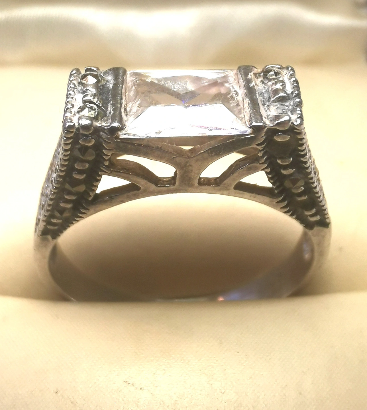 Experience the geometric elegance of the Art Deco era with this exquisite sterling silver revival ring. This piece features a striking emerald-cut clear synthetic spinel (7mm x 5mm) held in a multi-tiered gallery. The face of the ring is meticulously accented with bead-set shimmering marcasite stones and finished with fine milgrain edging.