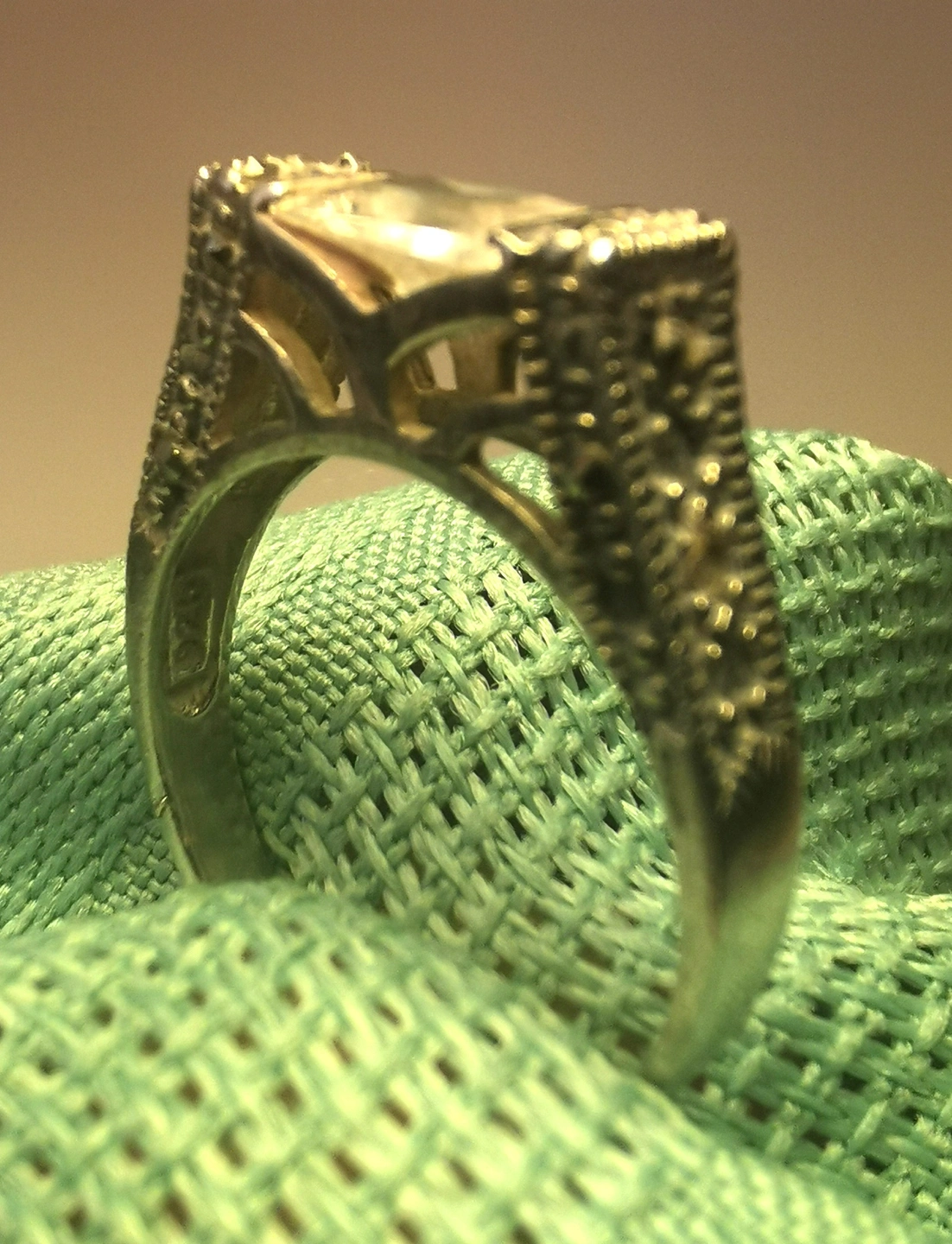 Condition: This item is in good vintage condition light wear consistent with its age. All marcasite accents are present and securely seated. The silver has a light, attractive patina that defines the architectural details of the setting. Please reference photos as they are part of the description of the item.