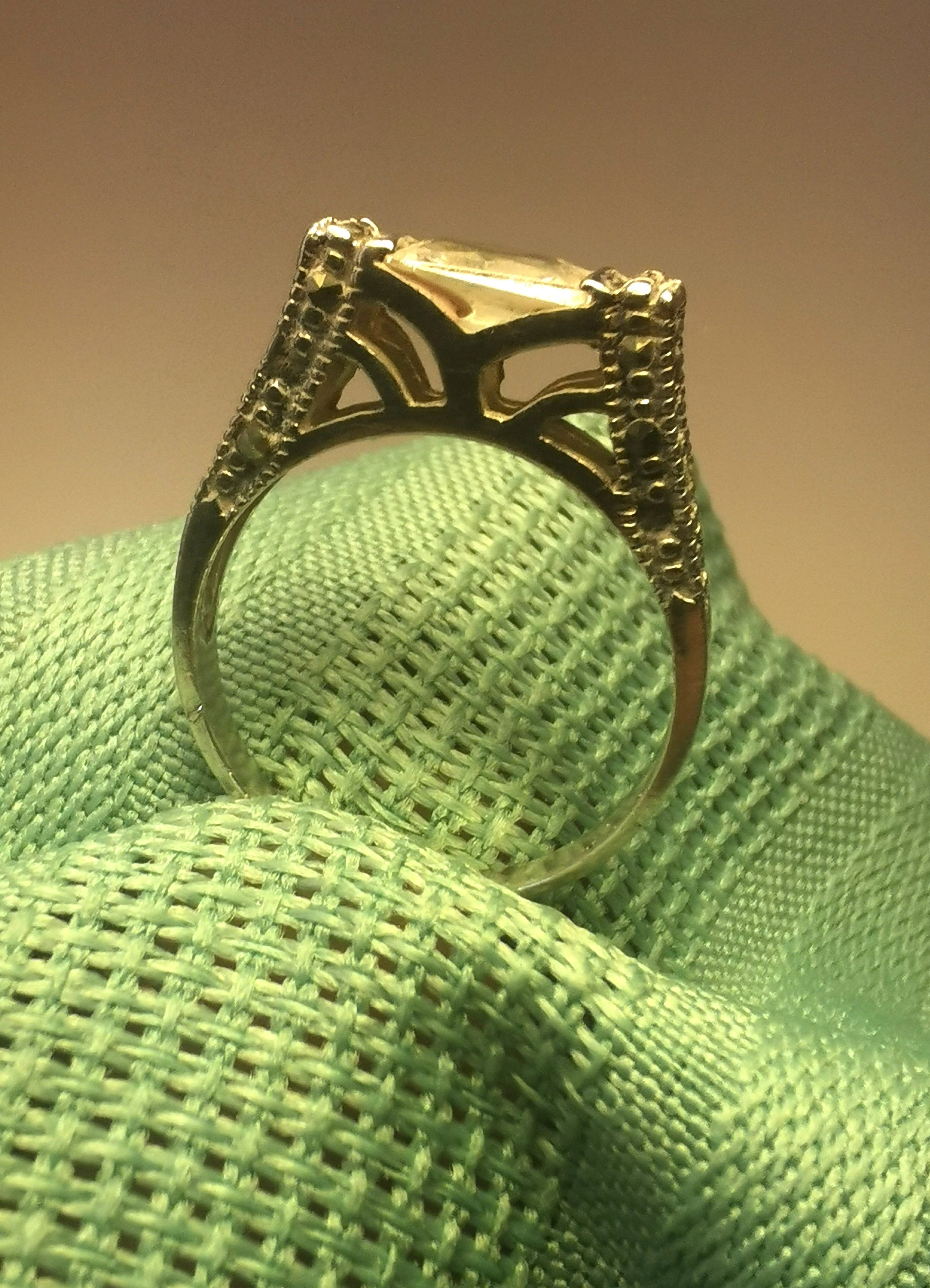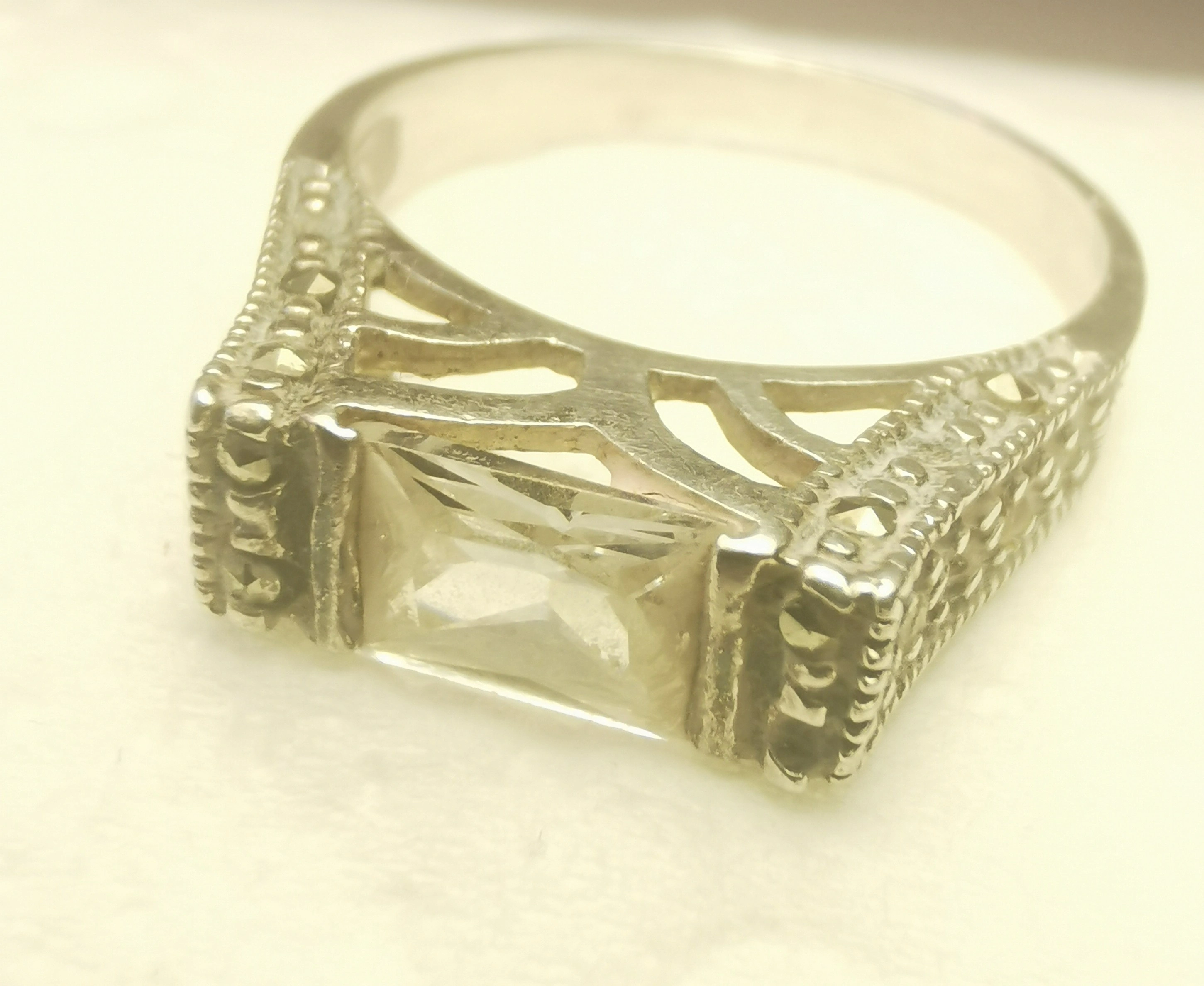 Condition: This item is in good vintage condition light wear consistent with its age. All marcasite accents are present and securely seated. The silver has a light, attractive patina that defines the architectural details of the setting. Please reference photos as they are part of the description of the item.