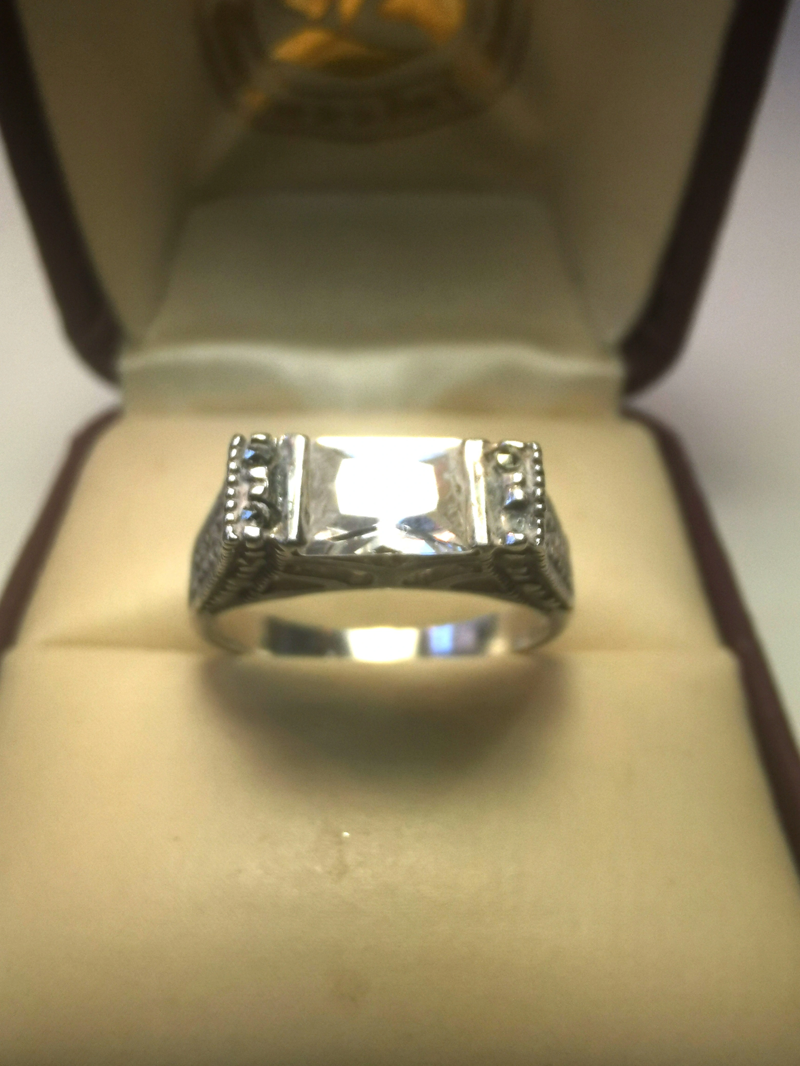 Experience the geometric elegance of the Art Deco era with this exquisite sterling silver revival ring. This piece features a striking emerald-cut clear synthetic spinel (7mm x 5mm) held in a multi-tiered gallery. The face of the ring is meticulously accented with bead-set shimmering marcasite stones and finished with fine milgrain edging.