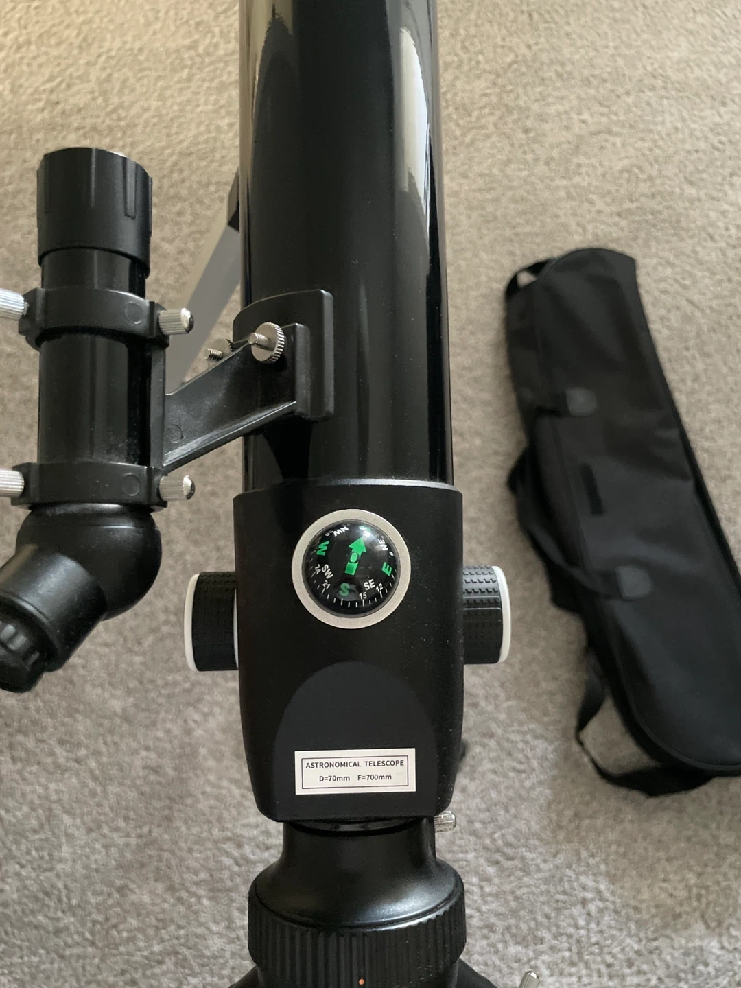 This is a black astronomical telescope. It includes a carrying bag and a tripod. The telescope has a focal length of 700mm and an aperture of 70mm. It's a great tool for exploring the night sky!