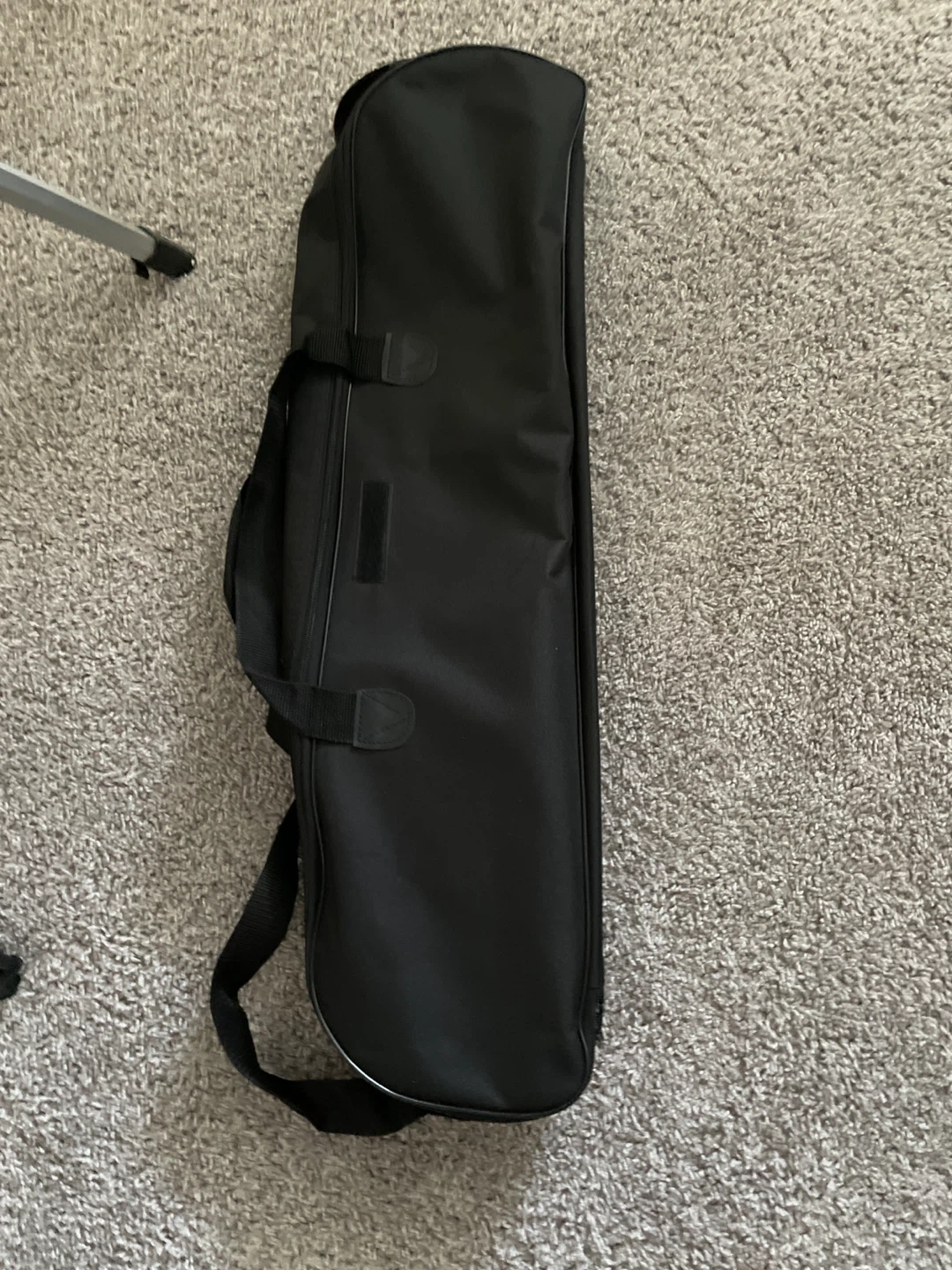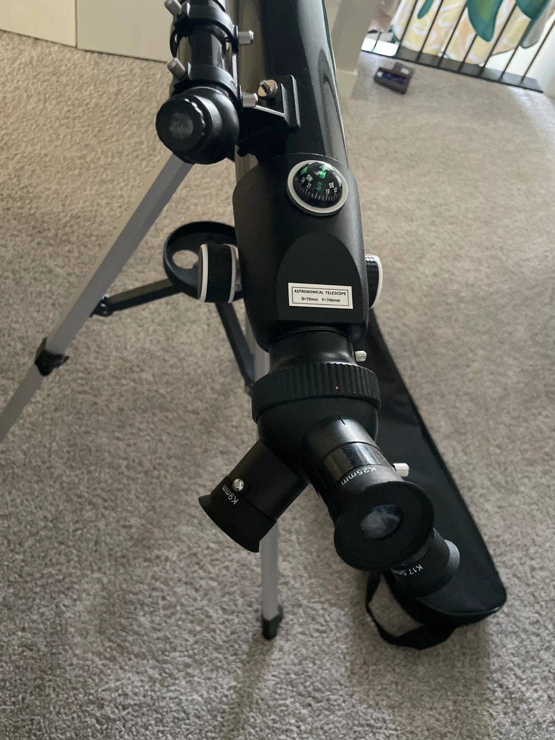 This is a black astronomical telescope. It includes a carrying bag and a tripod. The telescope has a focal length of 700mm and an aperture of 70mm. It's a great tool for exploring the night sky!