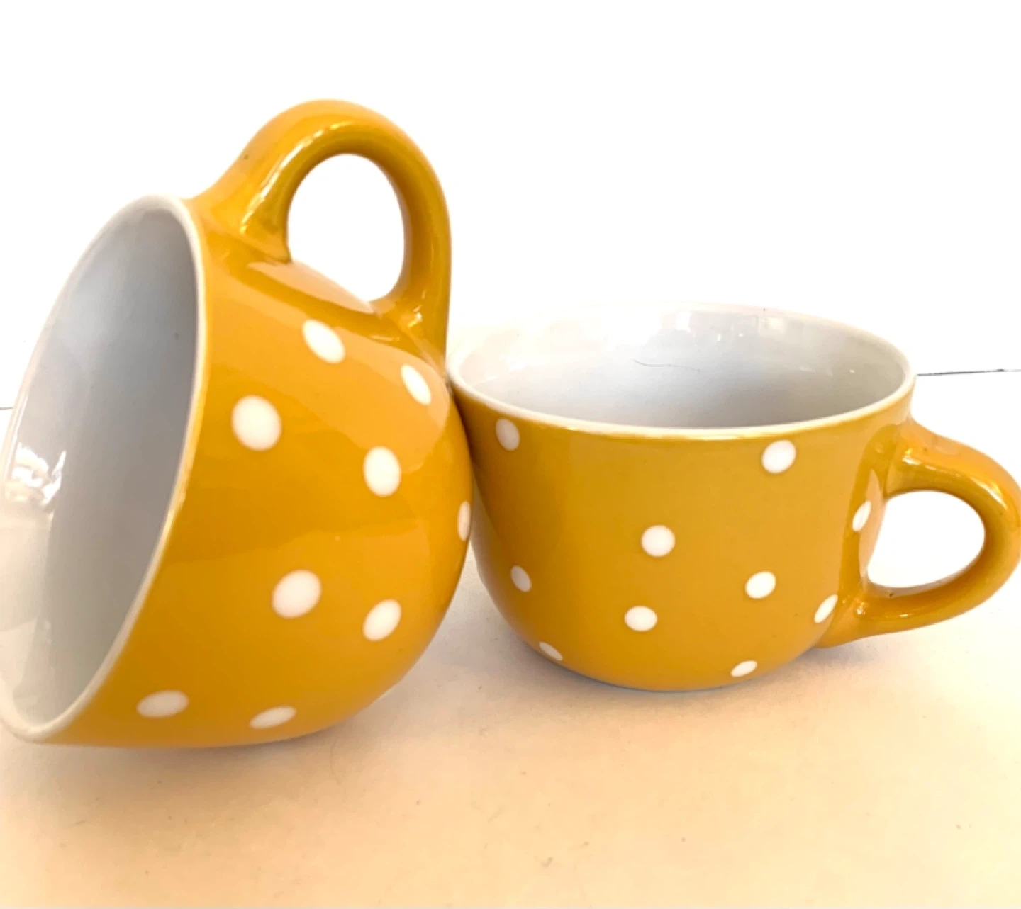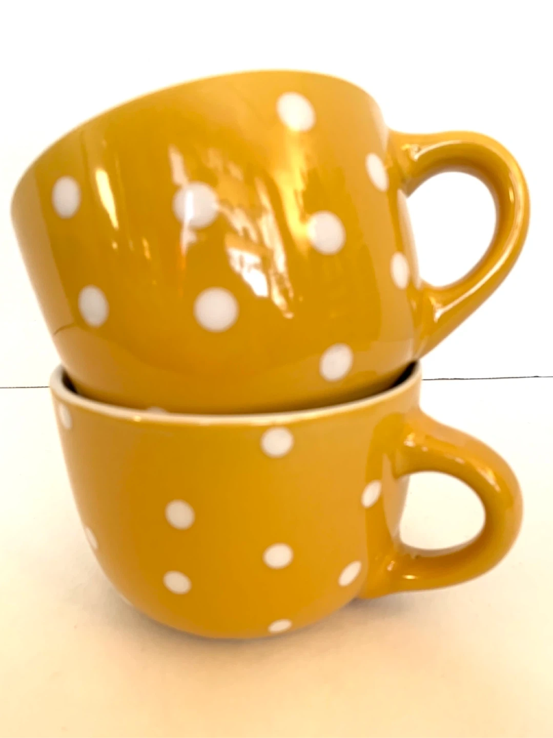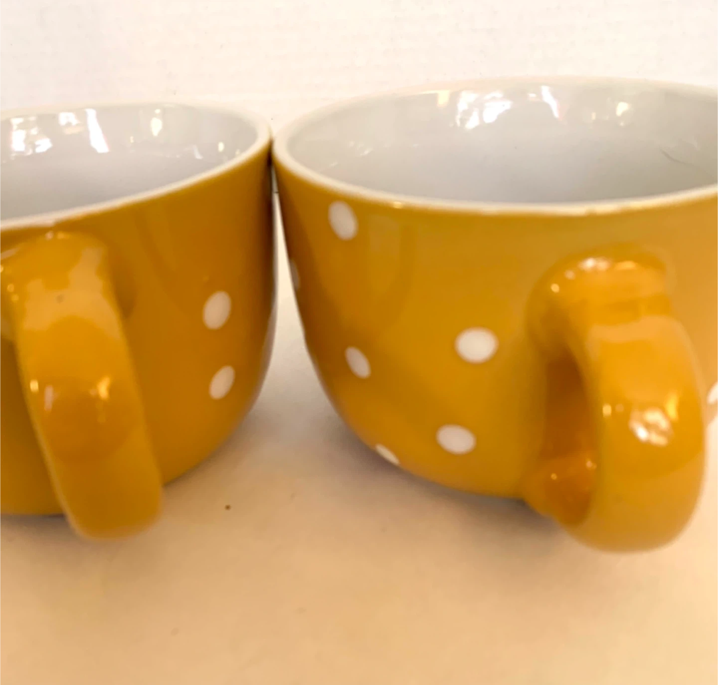 A cute set of two large mustard yellow mugs with white polka dots. They're made of ceramic and are perfect for enjoying your morning coffee or tea. The mugs are quite large so you could fill your coffee addiction or even fit a shake in them. Really fun addition to the kitchen.