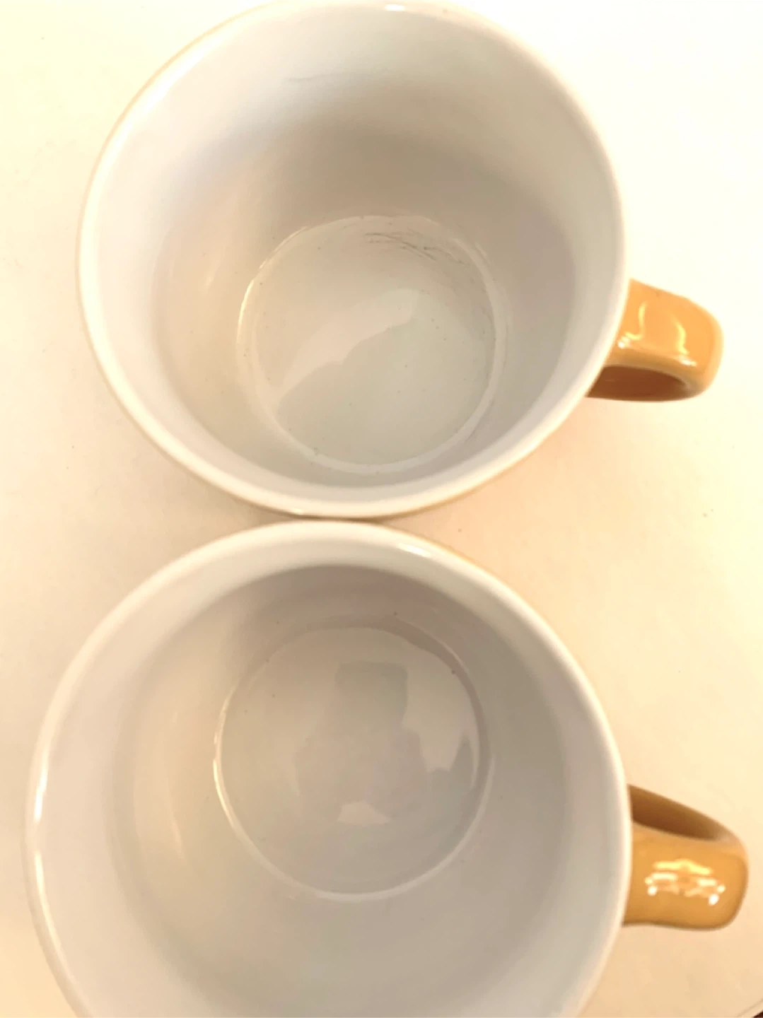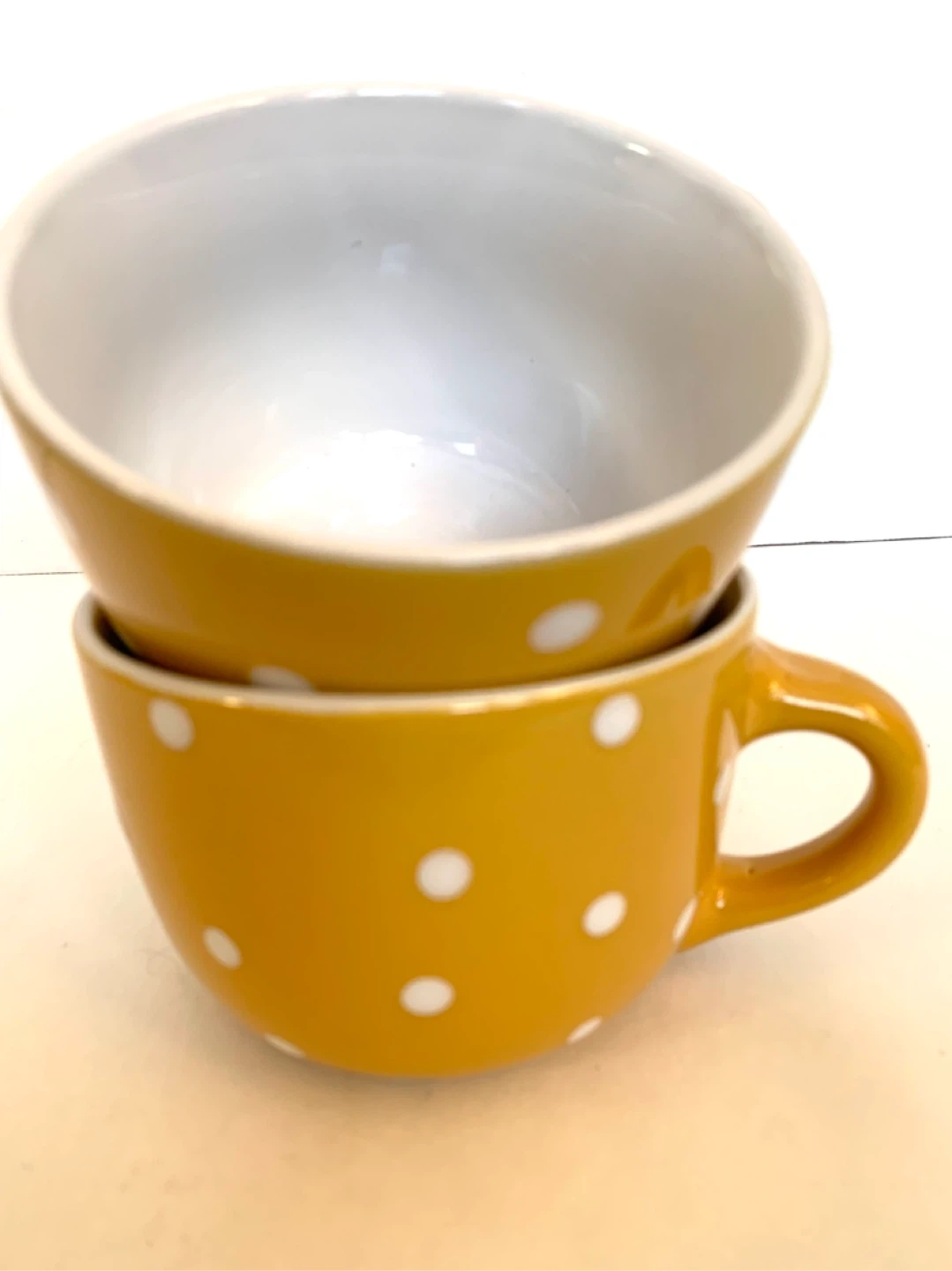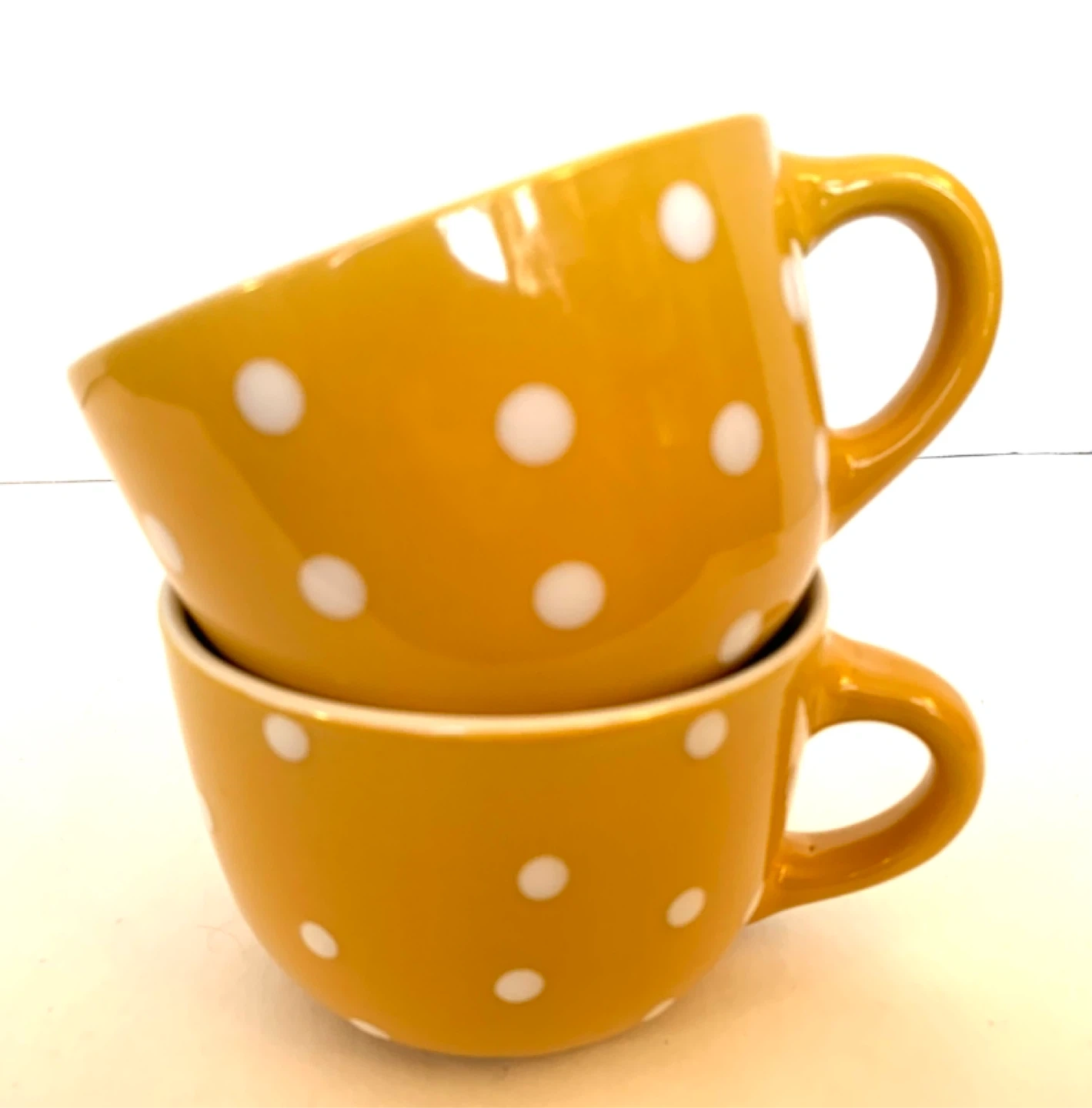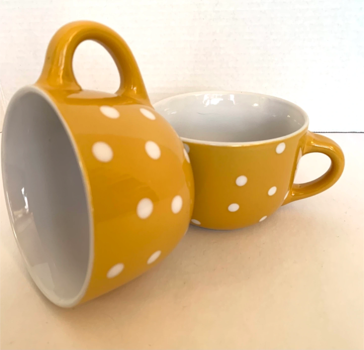 A cute set of two large mustard yellow mugs with white polka dots. They're made of ceramic and are perfect for enjoying your morning coffee or tea. The mugs are quite large so you could fill your coffee addiction or even fit a shake in them. Really fun addition to the kitchen.