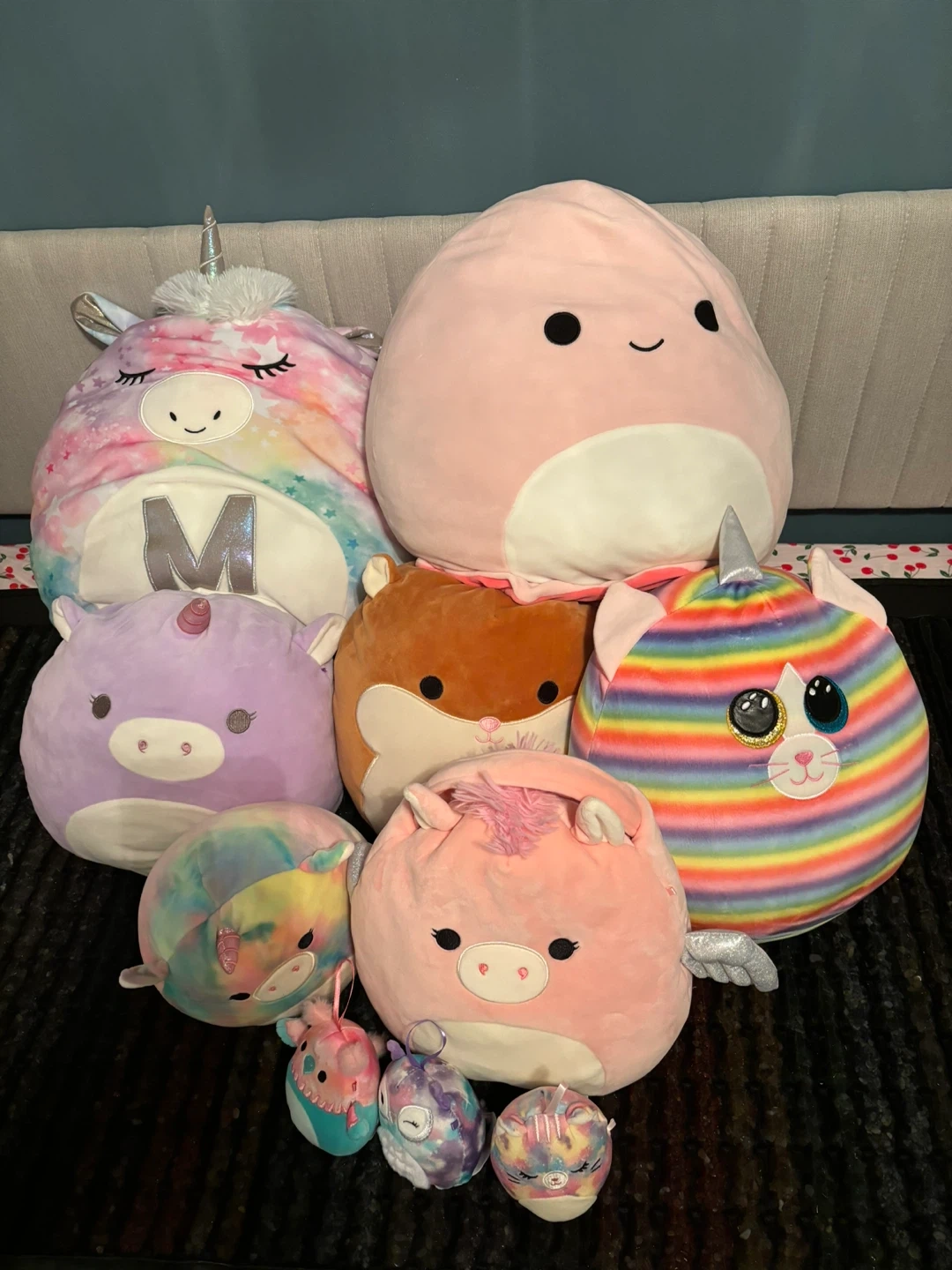 A collection of XL to Mini soft, huggable Squishmallows plush toys in various sizes and characters. Features include unicorns, a hamster, and a rainbow cat. They're made from super soft stretchy polyester. Perfect for playtime or cuddles!